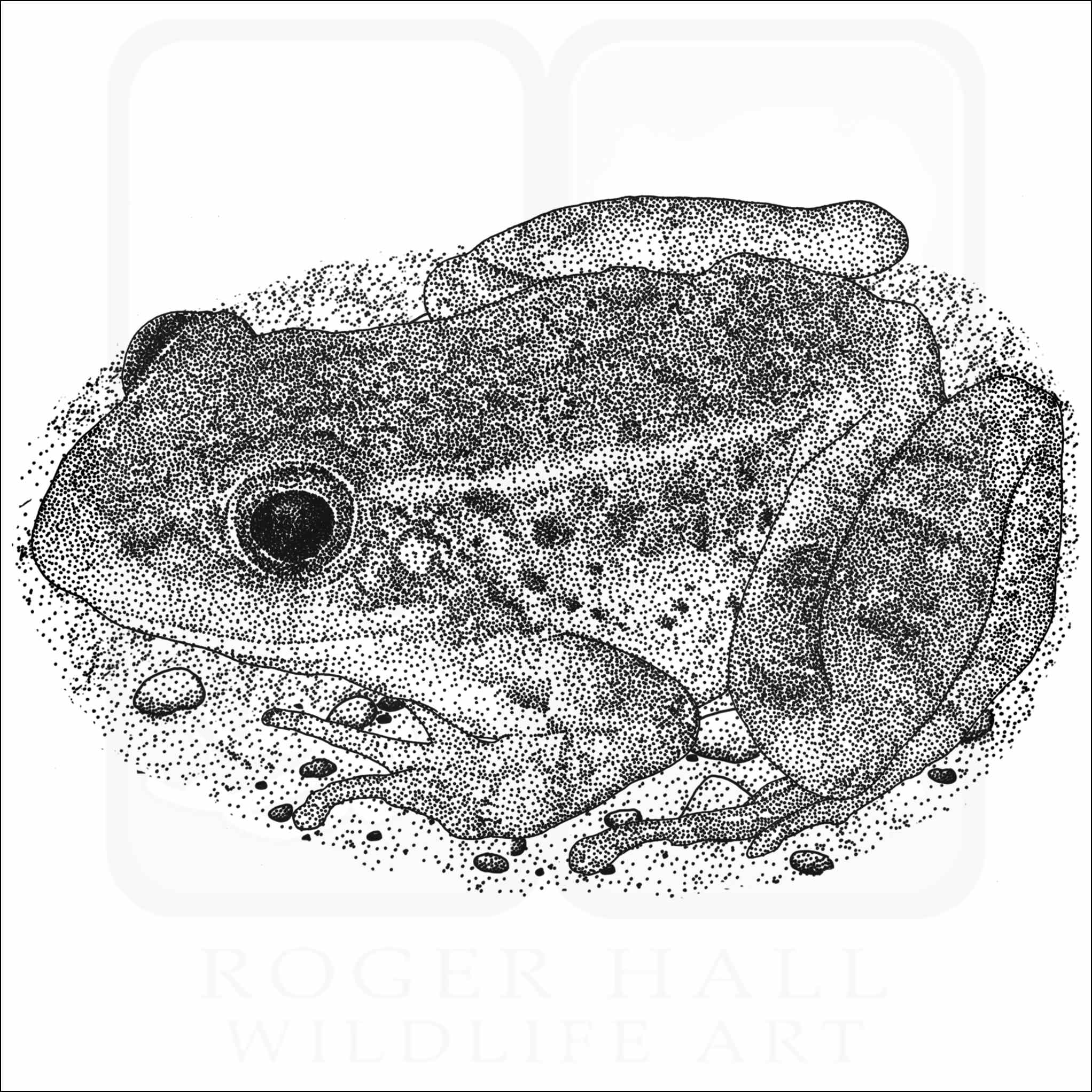 Fine art illustration of a Relict Leopard Frog (Rana onca.) The illustration is available in black and white or color.