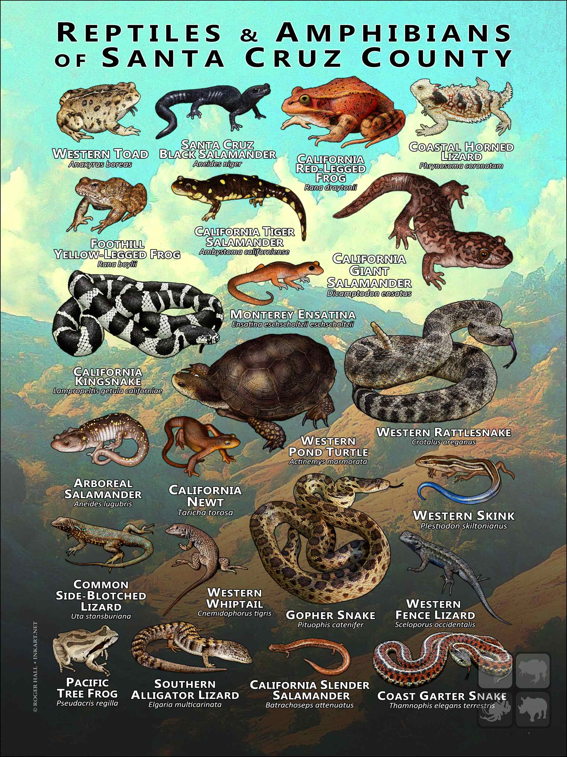 ARBOREAL SALAMANDER (Aneides lugubris) • CALIFORNIA KINGSNAKE (Lampropeltis getula californiae) • CALIFORNIA NEWT (Taricha torosa) • CALIFORNIA SLENDER SALAMANDER (Batrachoseps attenuatus) • CALIFORNIA RED-LEGGED FROG(Rana draytonii) • CALIFORNIA TIGER SALAMANDER (Ambystoma californiense) • COAST GARTER SNAKE (Thamnophis elegans terrestris) • COASTAL HORNED LIZARD (Phrynosoma coronatum) • COMMON SIDE-BLOTCHED LIZARD (Uta stansburiana) • FOOTHILL YELLOW-LEGGED FROG (Rana boylii) • GOPHER SNAKE (Pituophis catenifer) • MONTEREY ENSATINA (Ensatina eschscholtzii) • PACIFIC TREE FROG (Pseudacris regilla) • SANTA CRUZ BLACK SALAMANDER (Aneides niger) • SOUTHERN ALLIGATOR LIZARD (Elgaria multicarinata) • WESTERN FENCE LIZARD (Sceloporus occidentalis) • WESTERN RATTLESNAKE (Crotalus oreganus) • WESTERN SKINK (Plestiodon skiltonianus) • WESTERN TOAD (Anaxyrus boreas) • WESTERN WHIPTAIL (Cnemidophorus tigris)
