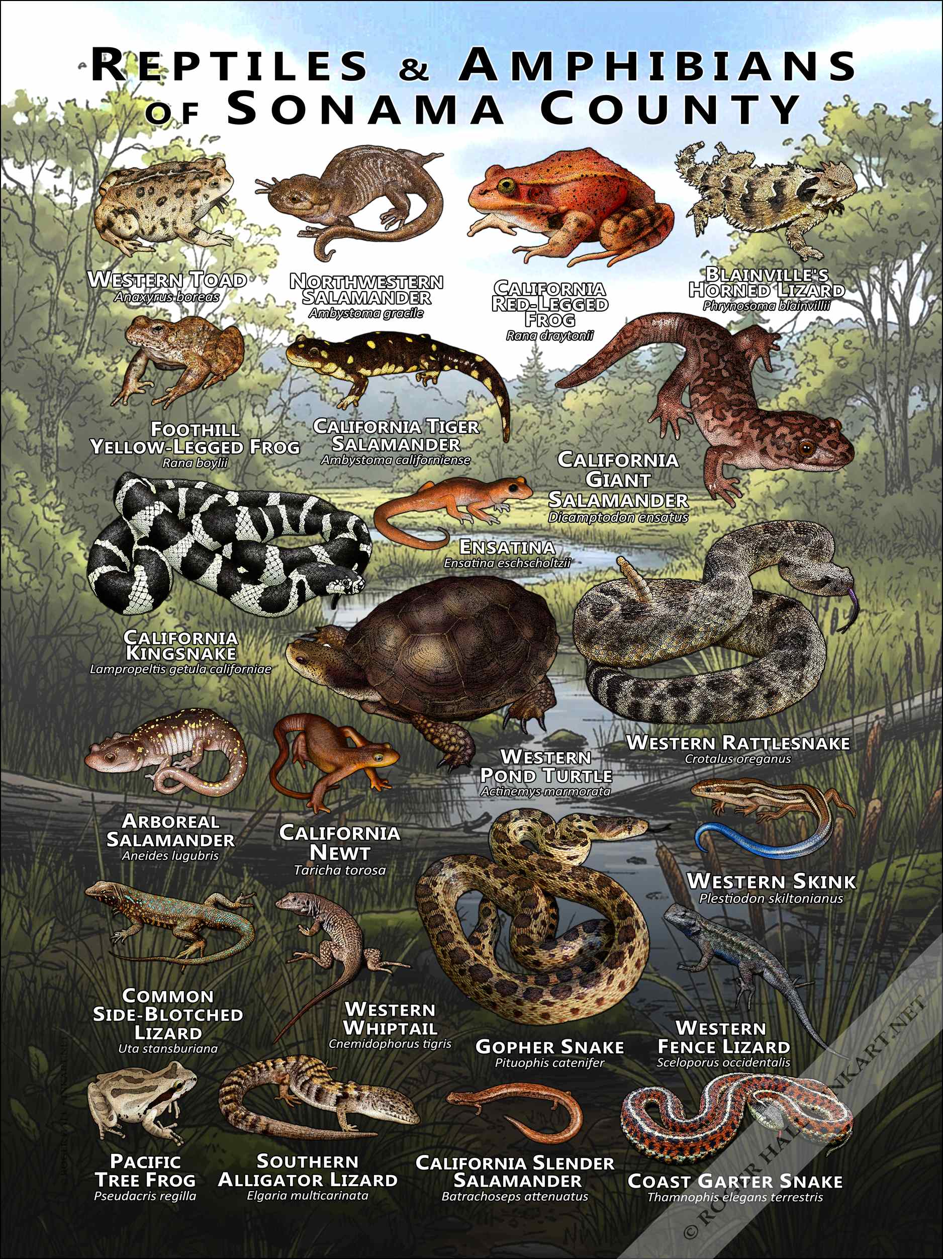 Sonoma County in Northern California has several different native species of amphibian and reptile. Here are they are on this poster, drawn beautifully and with amazing scientific accuracy.