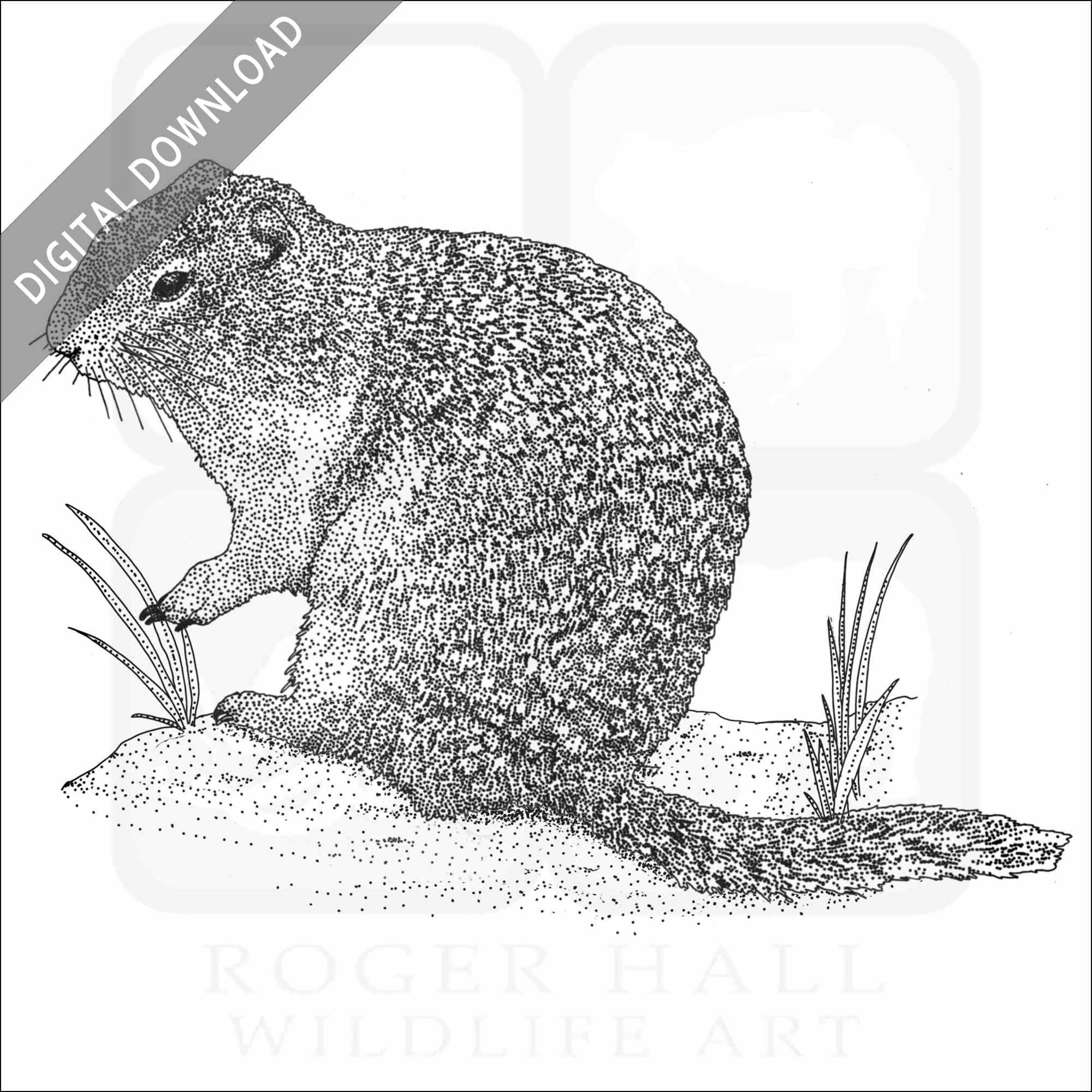 Stock art illustration of a Richardson’s Ground Squirrel (Urocitellus richardsonii.) The illustration is available in black and white or color for immediate download.