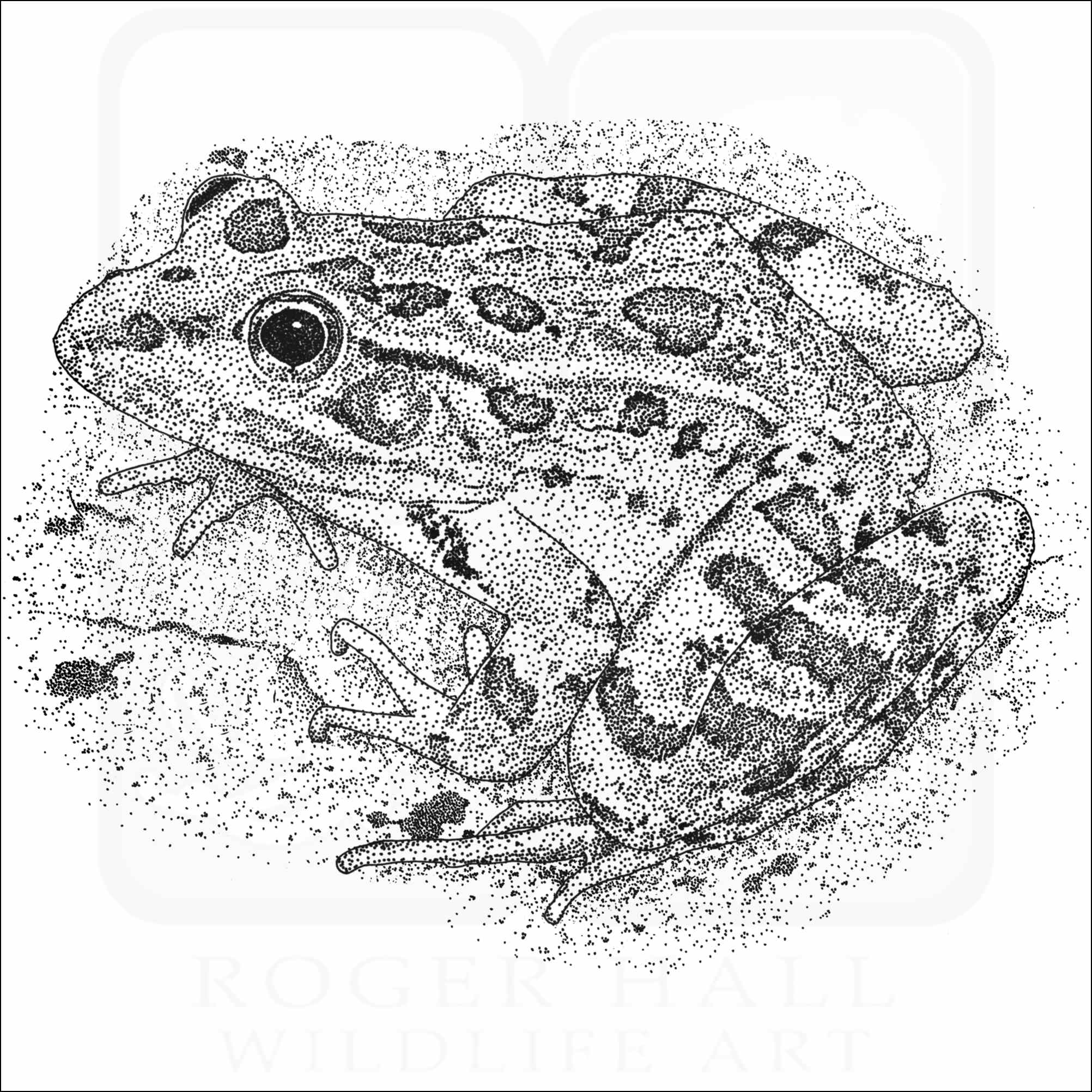 Fine art illustration of a Rio Grande Leopard Frog (Lithobates berlandieri.) The illustration is available in black and white or color.