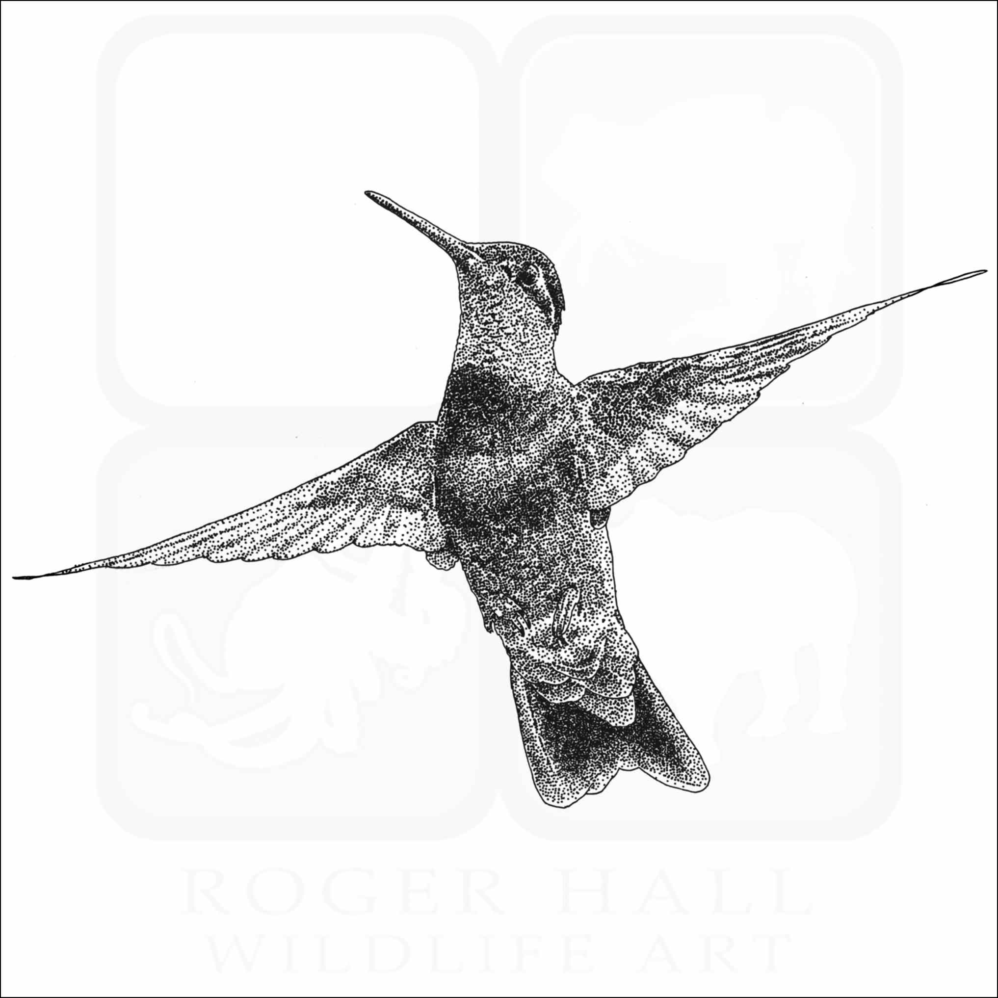 Fine art illustration of a Rivoli’s Hummingbird (Eugenes fulgens.) The illustration is available in black and white or color.