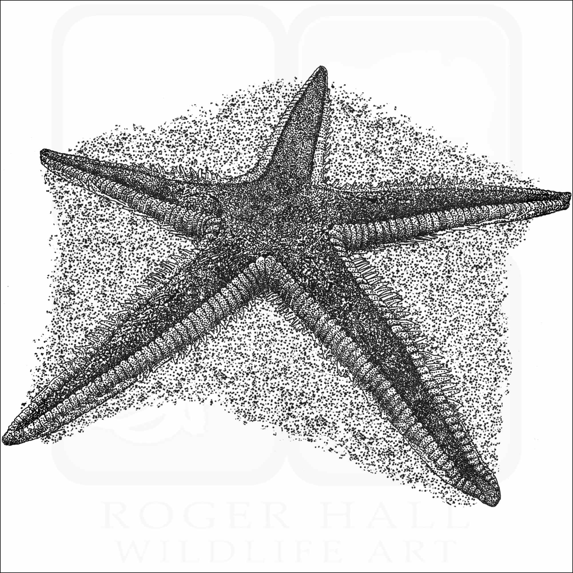 Fine art illustration of a Royal Starfish (Astropecten articulatus.) The illustration is available in black and white or color.
