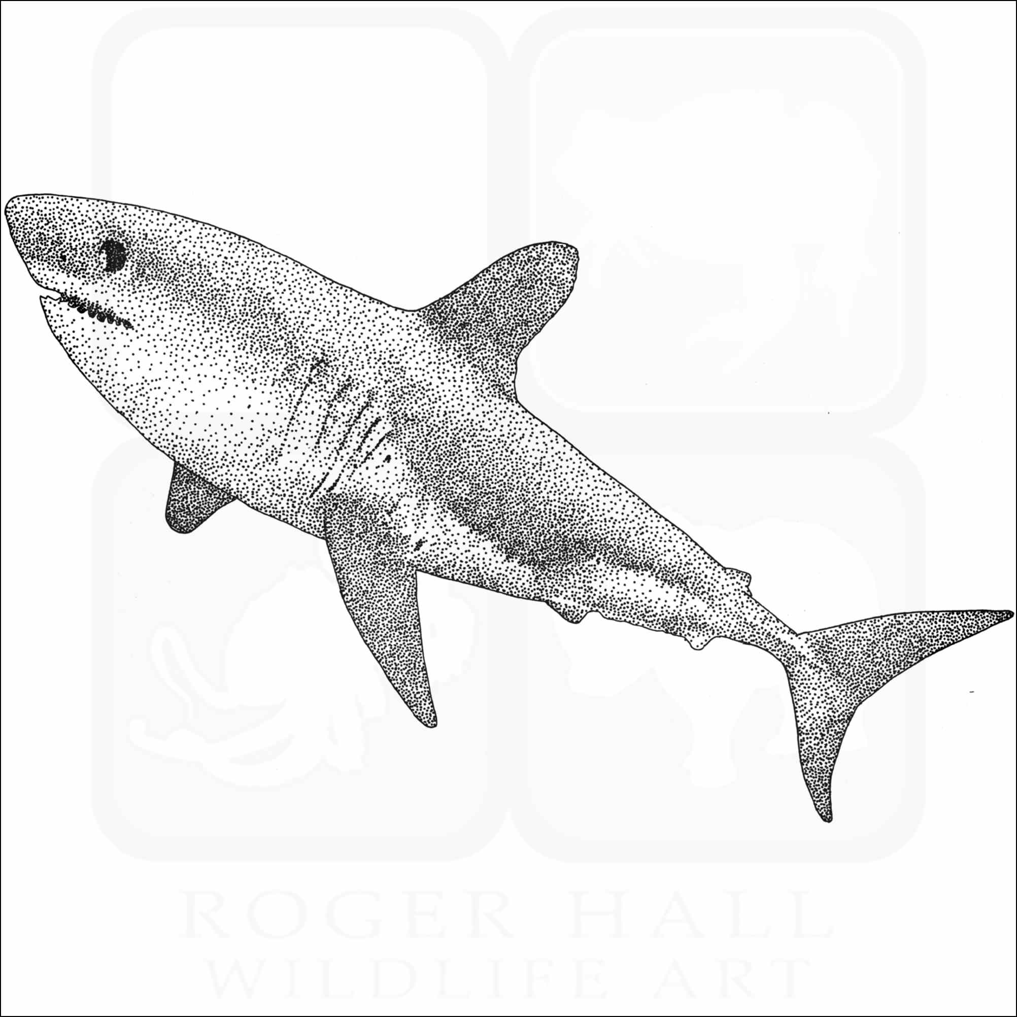 Fine art illustration of a Salmon Shark (Lamna ditropis.) The illustration is available in black and white or color.