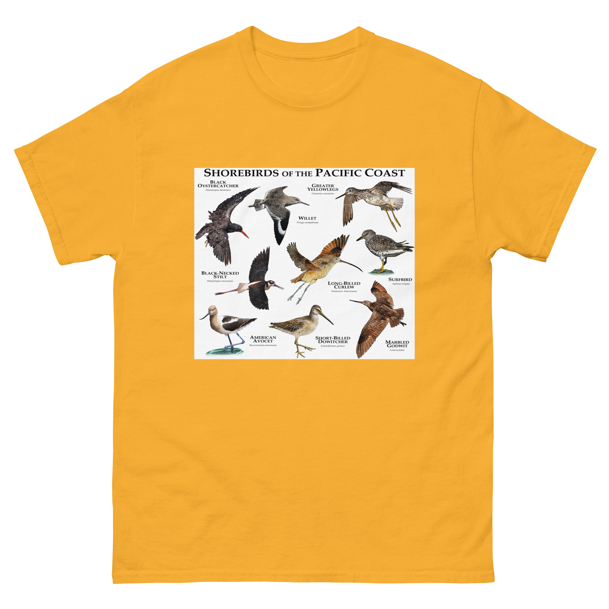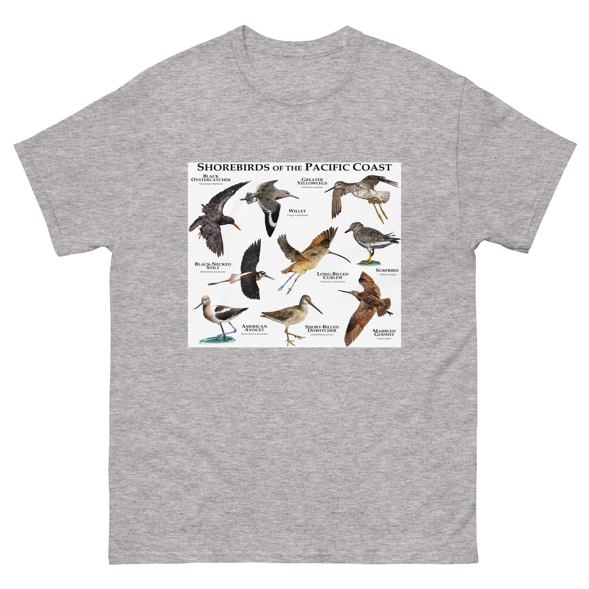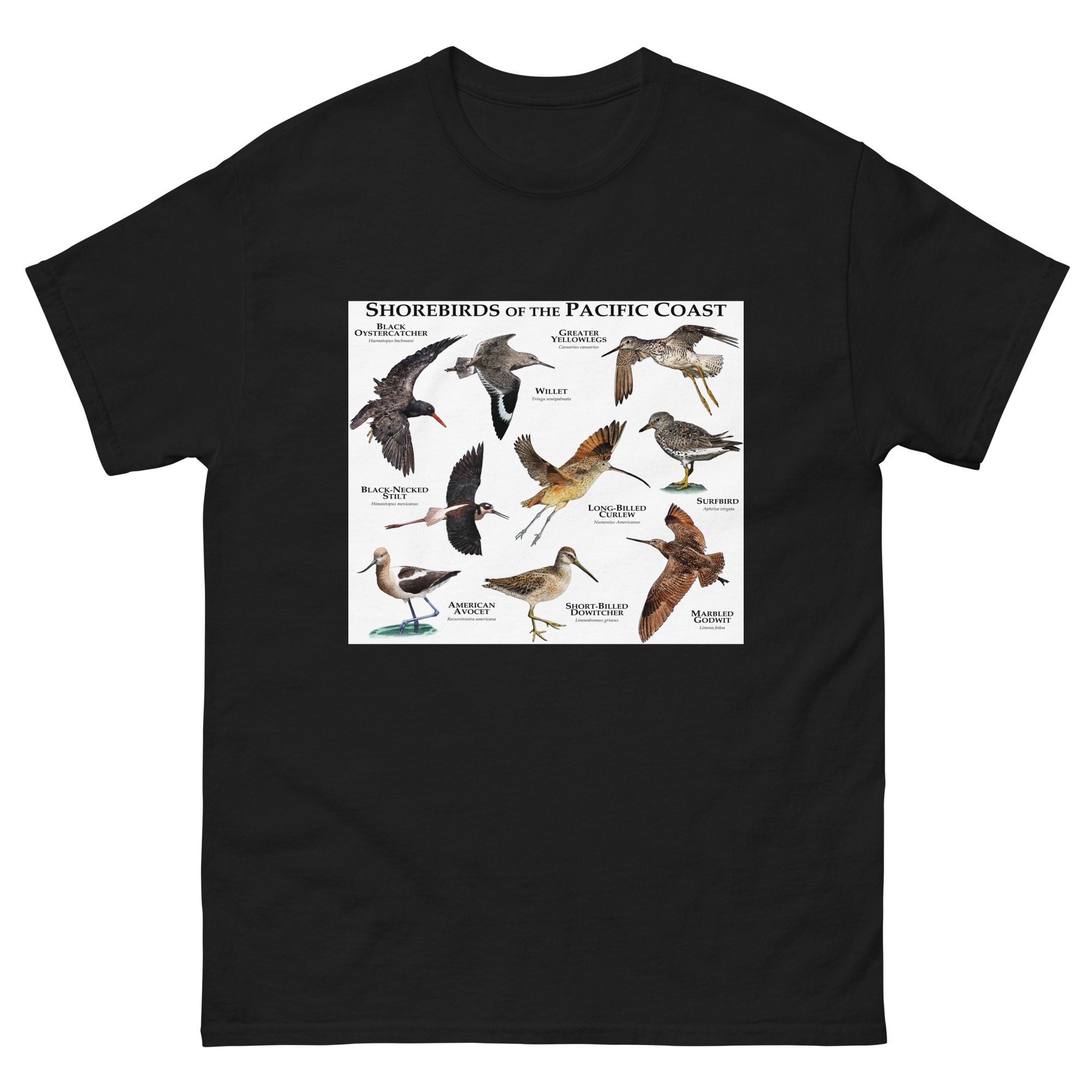 Fine art illustration of various species of shorebirds native to the Pacific Coast of North America printed on a high-quality men’s cotton t-shirt