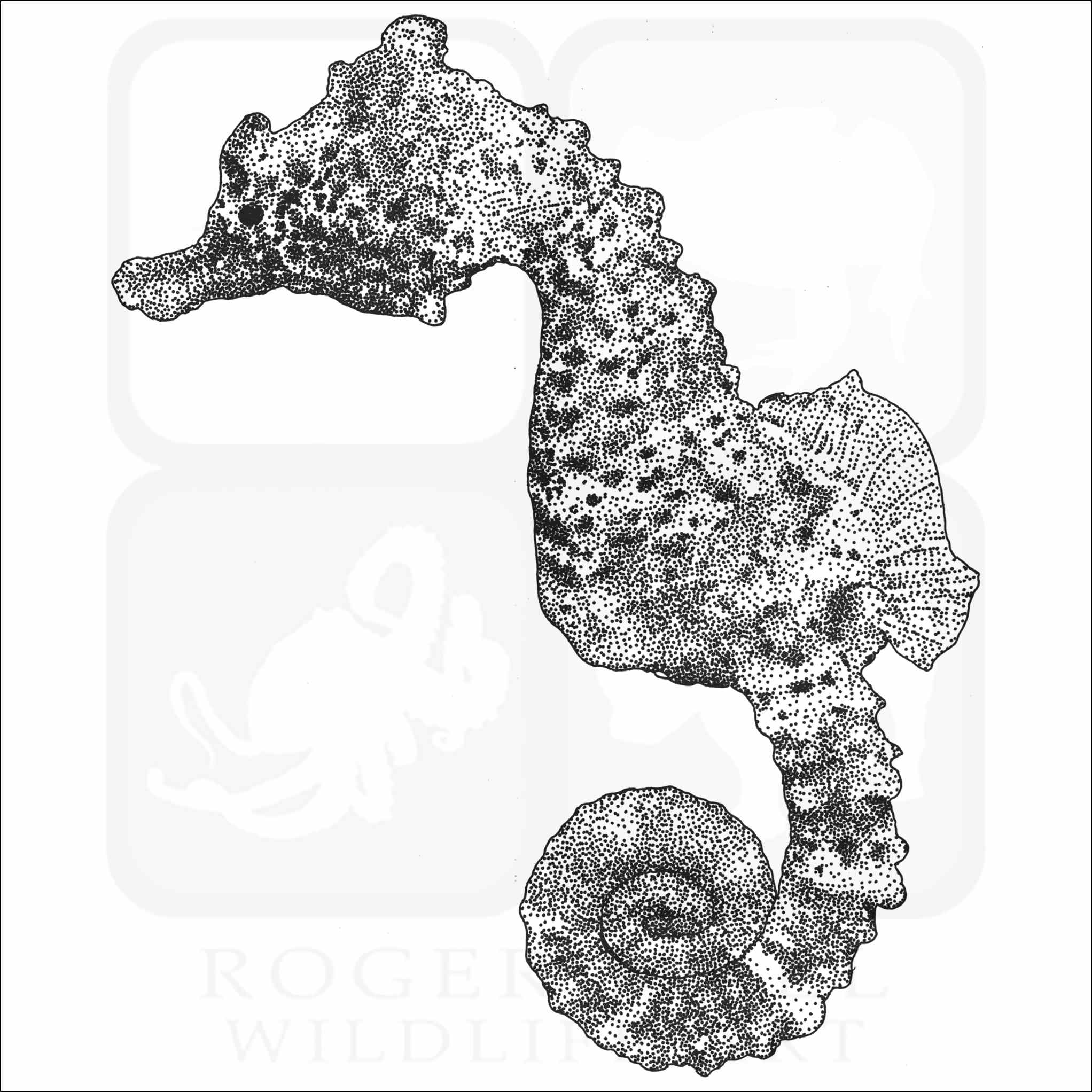 Fine art illustration of a Short-Snouted Seahorse (Hippocampus hippocampus.) The illustration is available in black and white or color.