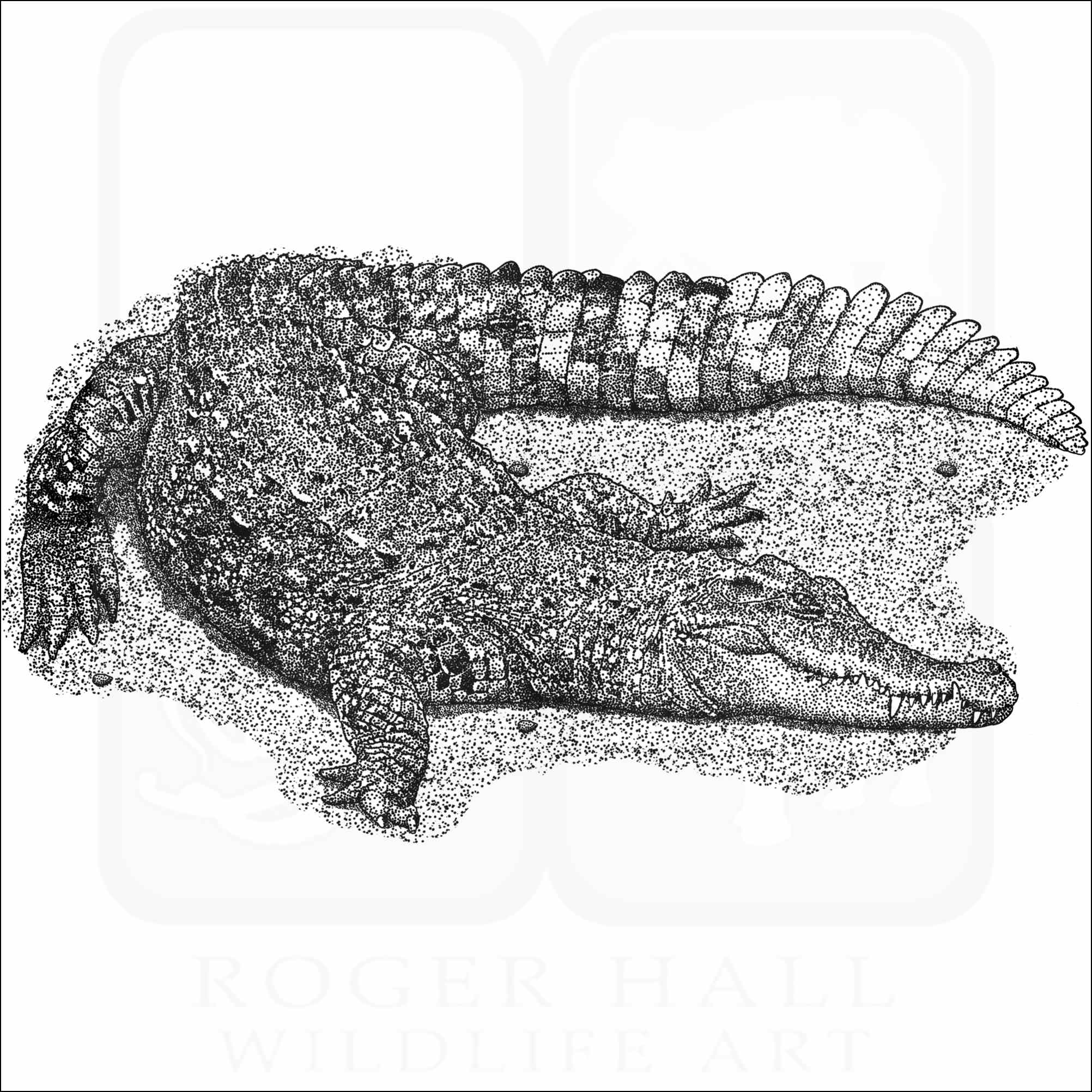 Fine art illustration of a Siamese Crocodile (Crocodylus siamensis.) The illustration is available in black and white or color.