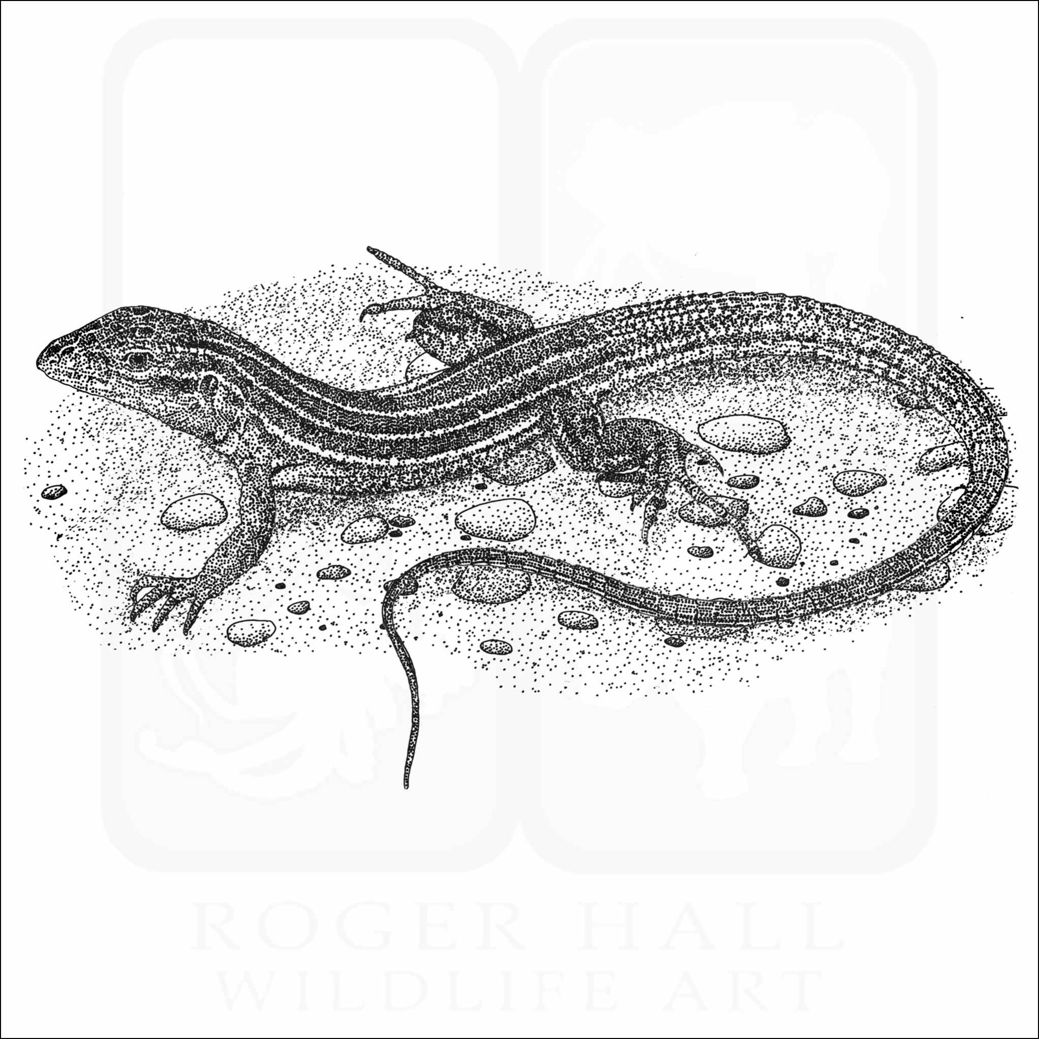 Fine art illustration of a Six-Lined Racerunner (Aspidoscelis sexlineata.) The illustration is available in black and white or color.