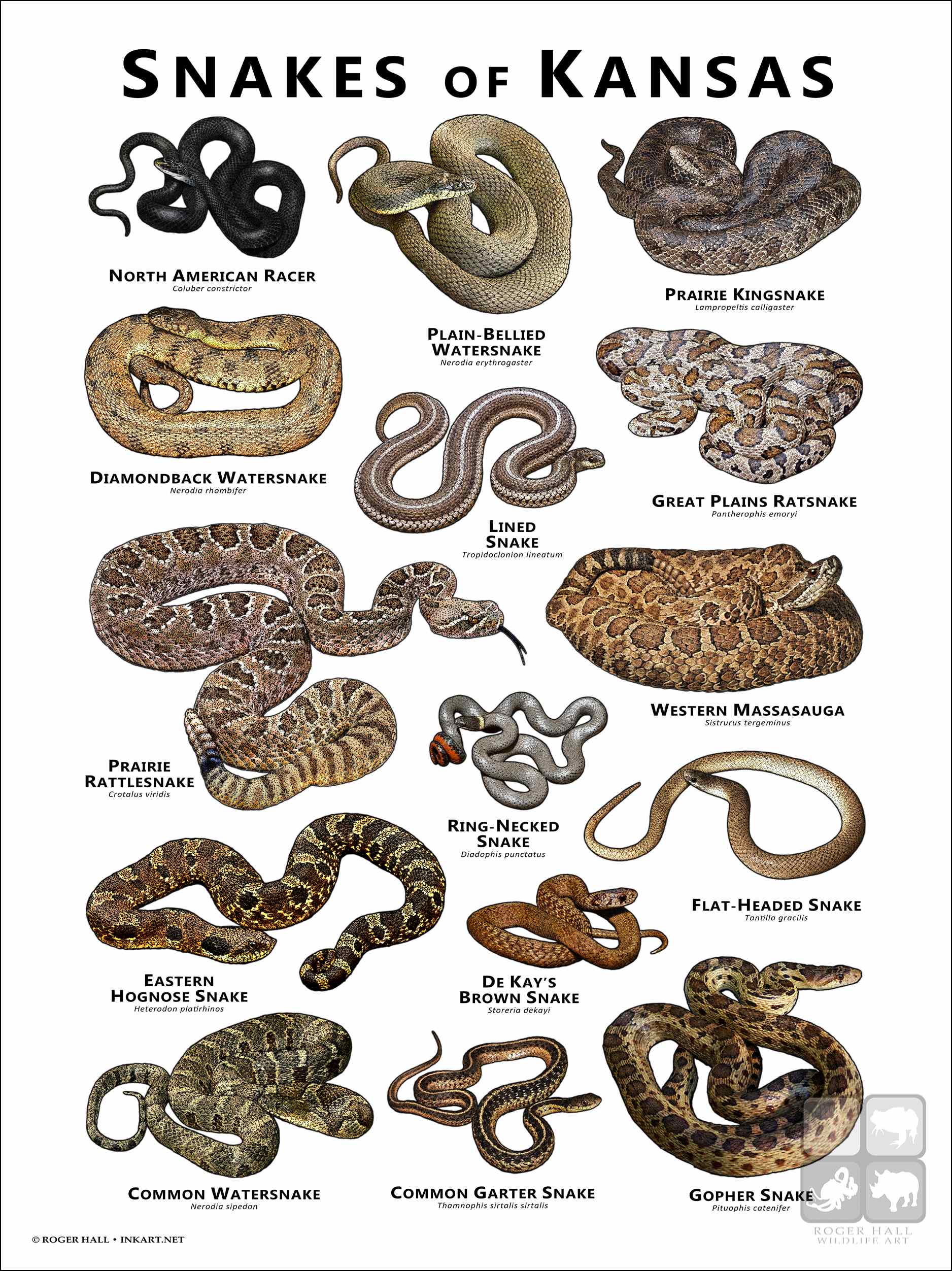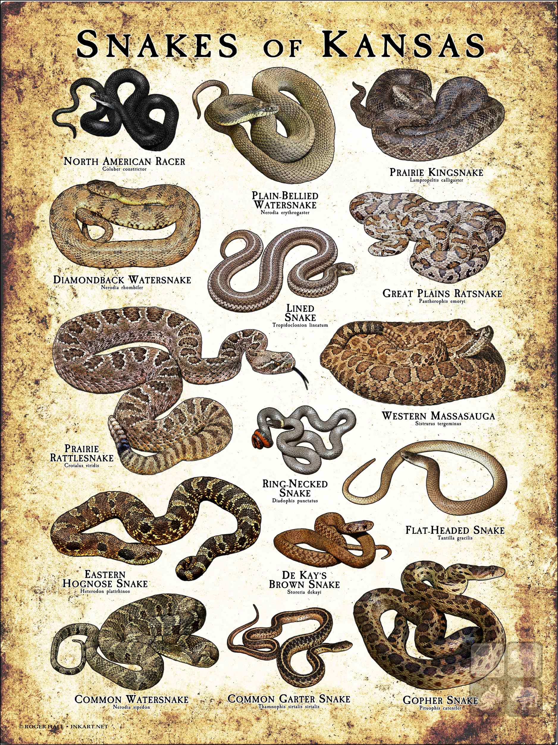 The US state of Kansas has several different native species of venomous and non-venomous snakes. Here are some select species printed on a colorful, high quality poster. All images are drawn beautifully and with amazing scientific accuracy.