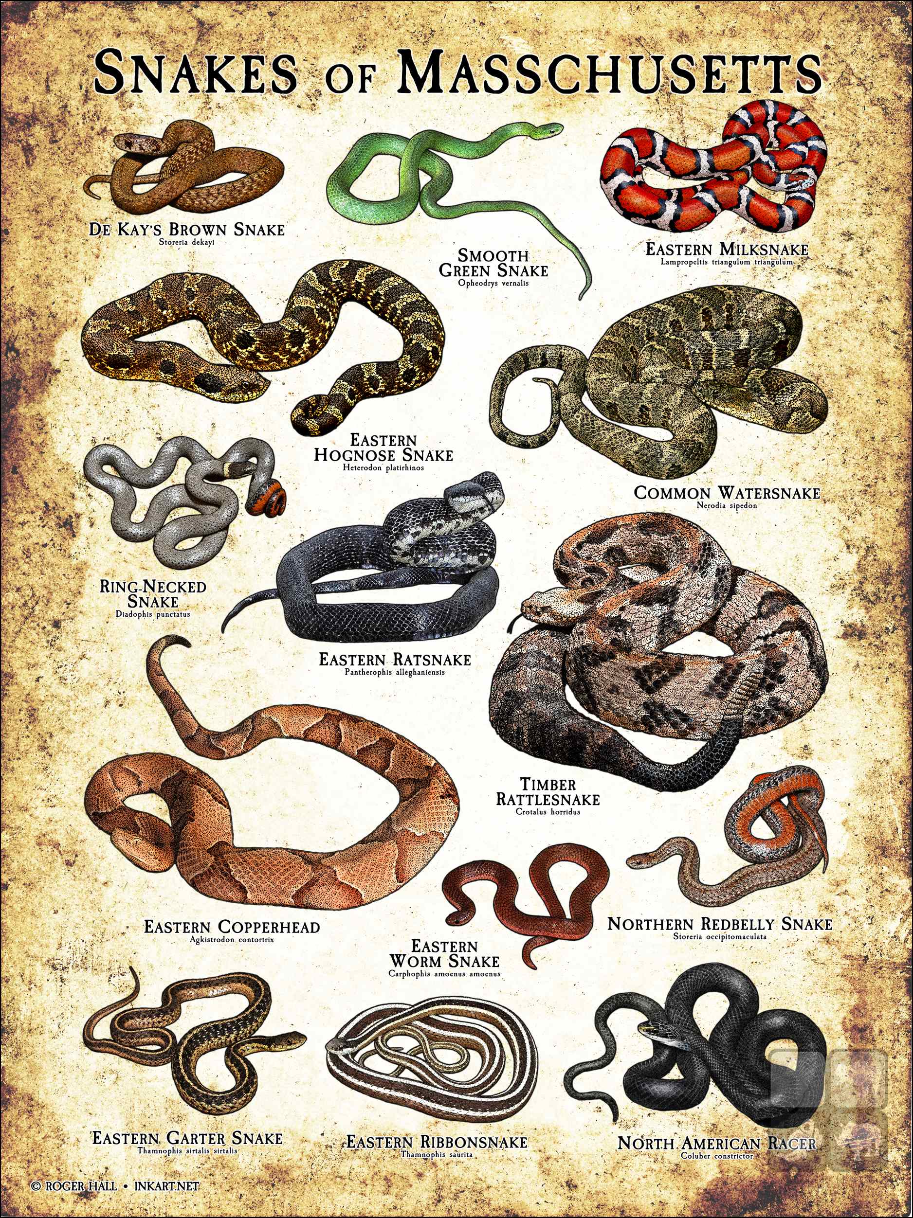 The US state of Massachusetts has several different native species of venomous and non-venomous snakes. Here are all of those snake species printed on a colorful, high quality poster. All images are drawn beautifully and with amazing scientific accuracy.
