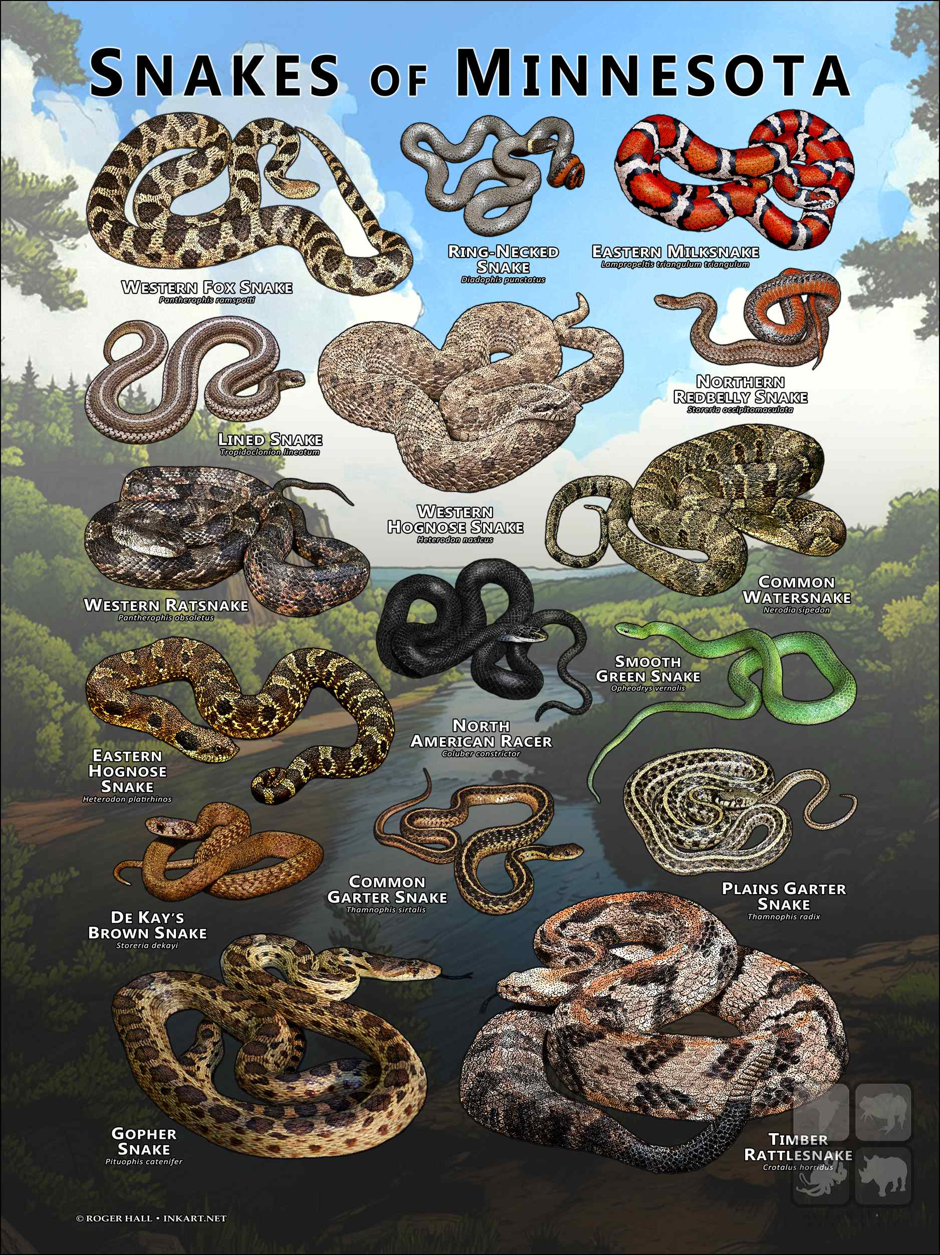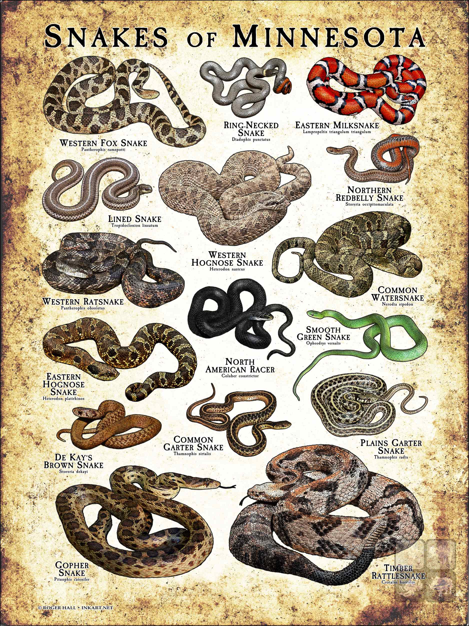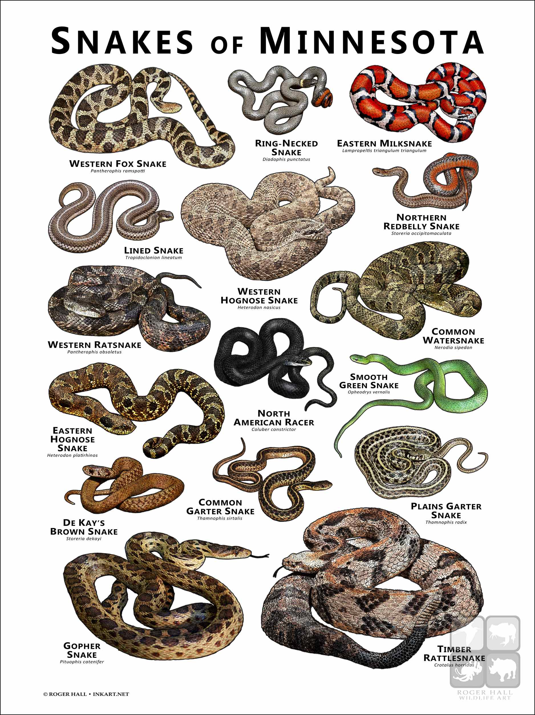 COMMON WATERSNAKE (Nerodia sipedon) • DE KAY’S BROWN SNAKE (Storeria dekayi) • COMMON GARTER SNAKE (Thamnophis sirtalis) •EASTERN HOGNOSE SNAKE (Heterodon platirhinos) • EASTERN MILKSNAKE (Lampropeltis triangulum triangulum) • GOPHER SNAKE (Pituophis catenifer) • LINED SNAKE (Tropidoclonion lineatum) • NORTH AMERICAN RACER (Coluber constrictor) • NORTHERN REDBELLY SNAKE (Storeria occipitomaculata) • PLAINS GARTER SNAKE (Thamnophis radix) • RING-NECKED SNAKE (Diadophis punctatus) • SMOOTH GREEN SNAKE (Opheodrys vernalis) • TIMBER RATTLESNAKE (Crotalus horridus) • WESTERN FOX SNAKE (Pantherophis ramspotti) • WESTERN HOGNOSE SNAKE (Heterodon nasicus) • WESTERN RATSNAKE (Pantherophis obsoletus)
