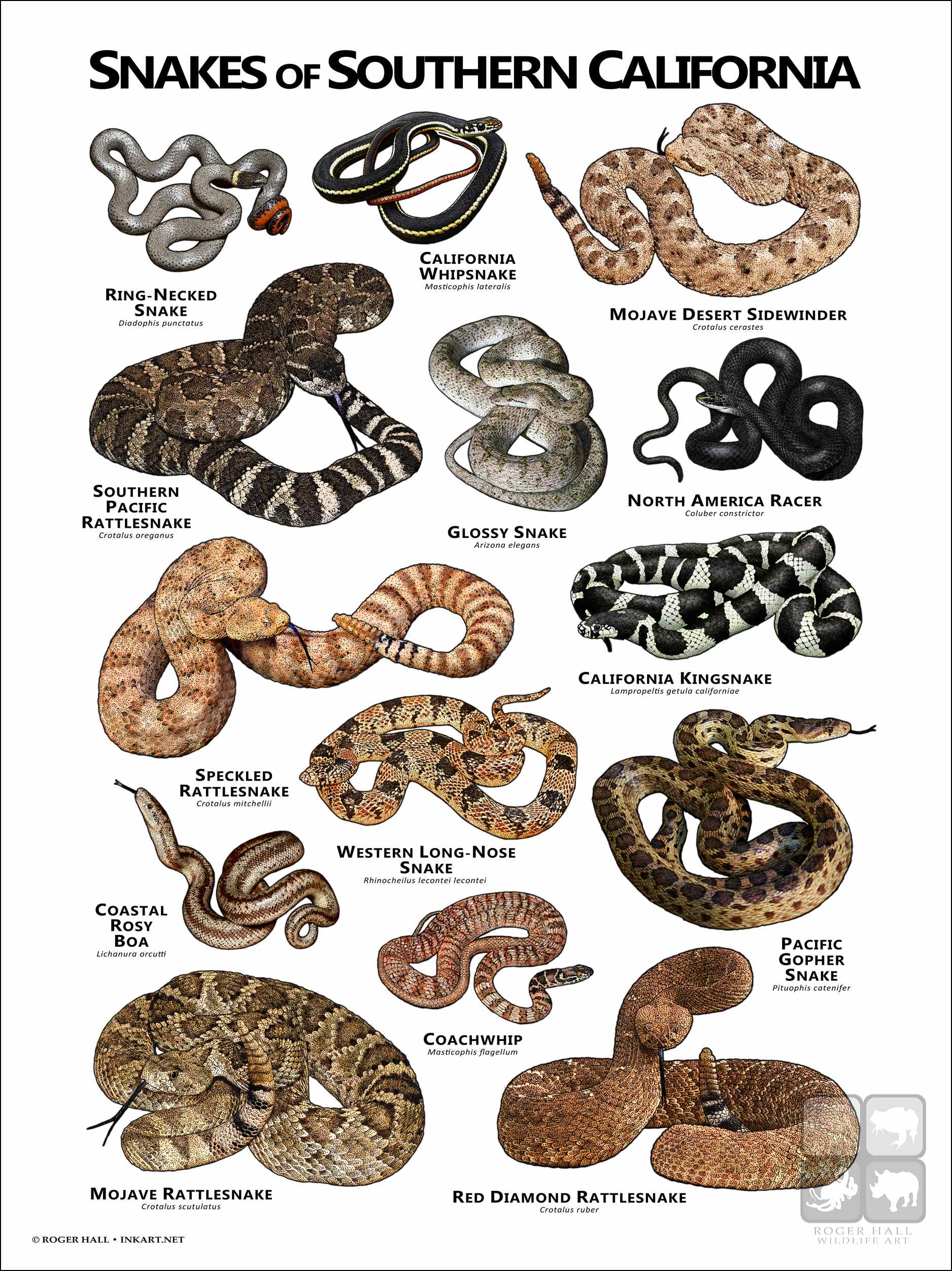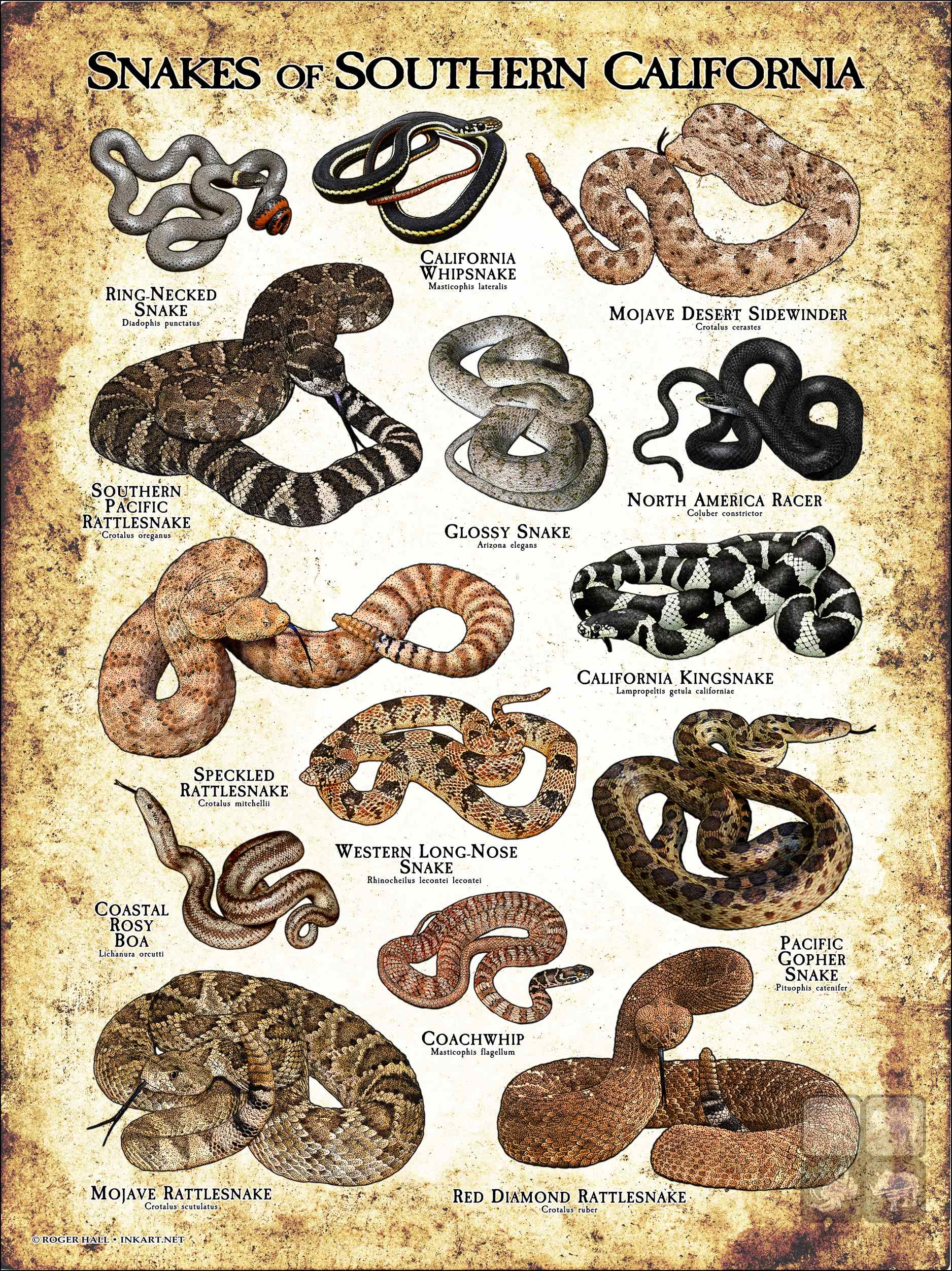 Southern California in the USA has several different native species of venomous and non-venomous snakes. Here are some select species printed on a colorful, high quality poster. All images are drawn beautifully and with amazing scientific accuracy.