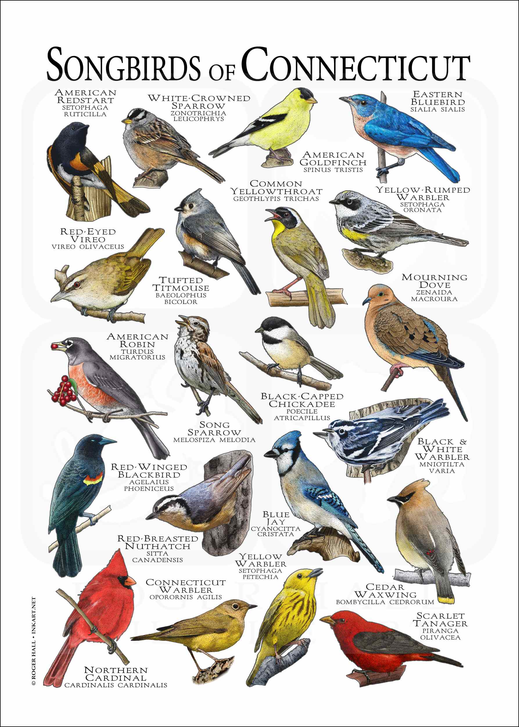 A colorful collage of scientifically accurate illustration of various species of songbird native to Connecticut in North America.