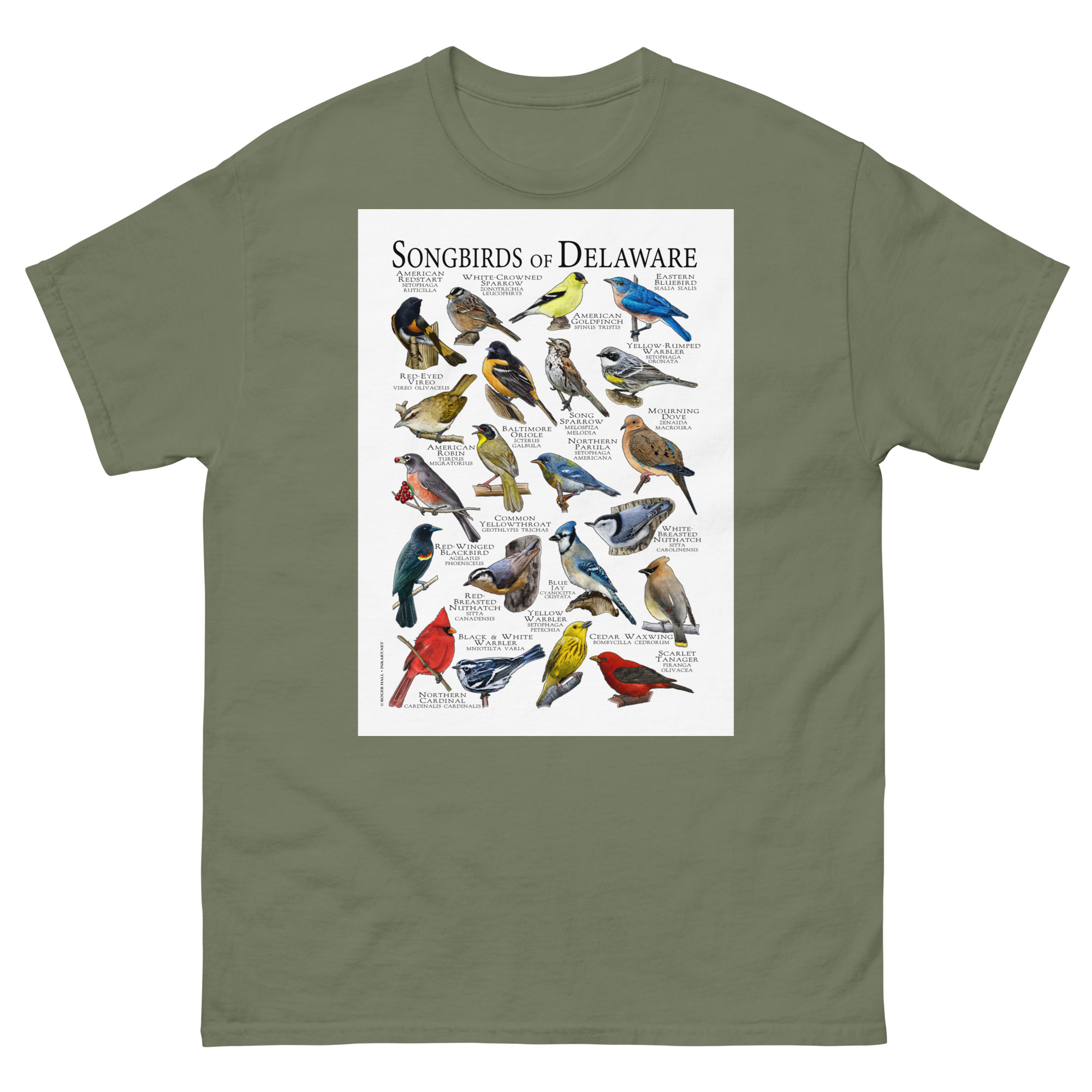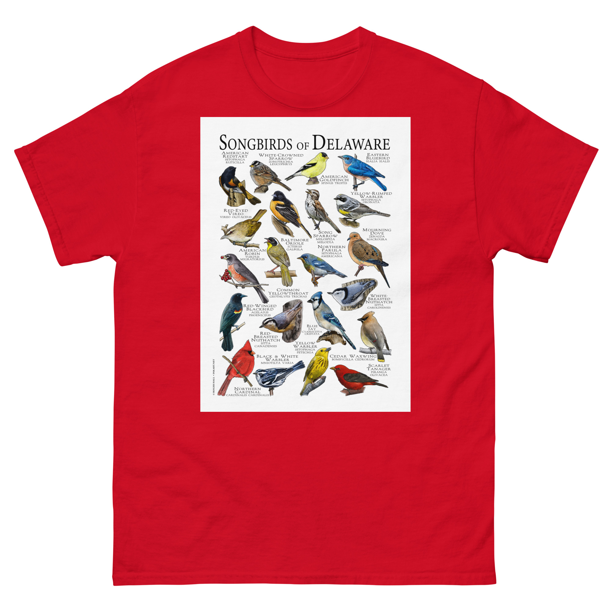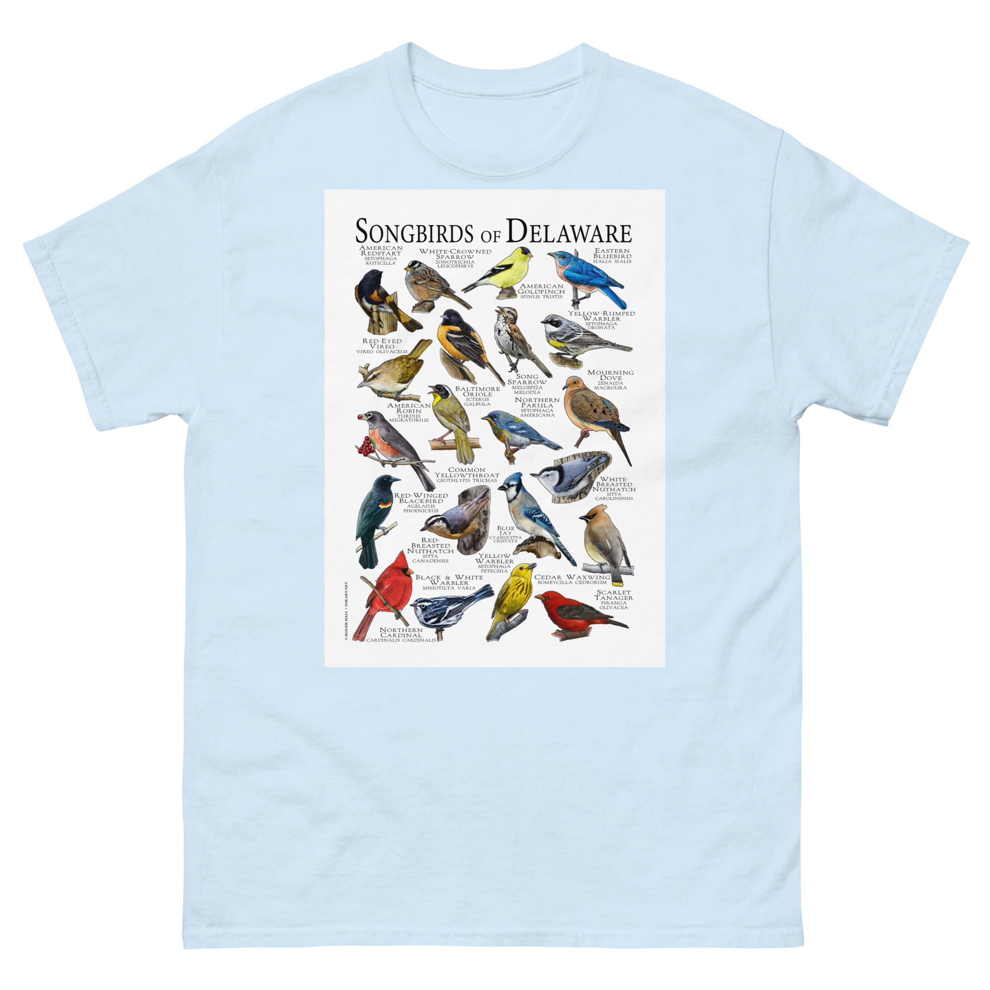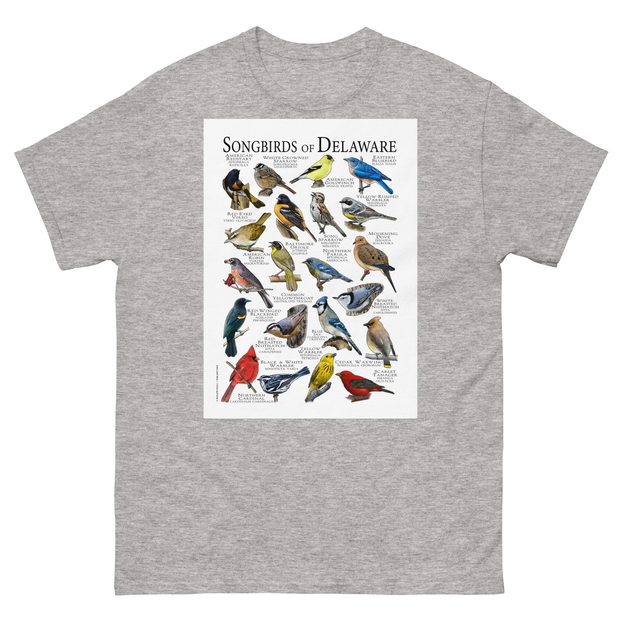 Songbirds – also known as the passerine birds – are any member of the suborder Passeri (or Oscines), of the order Passeriformes. The group including about 4,000 species in 35-55 families, which is nearly half the world’s birds. This artwork features high-quality illustrations of the various species of songbird native to the state of Delaware in the USA. The image is printed on a high-quality 100% men’s cotton t-shirt.