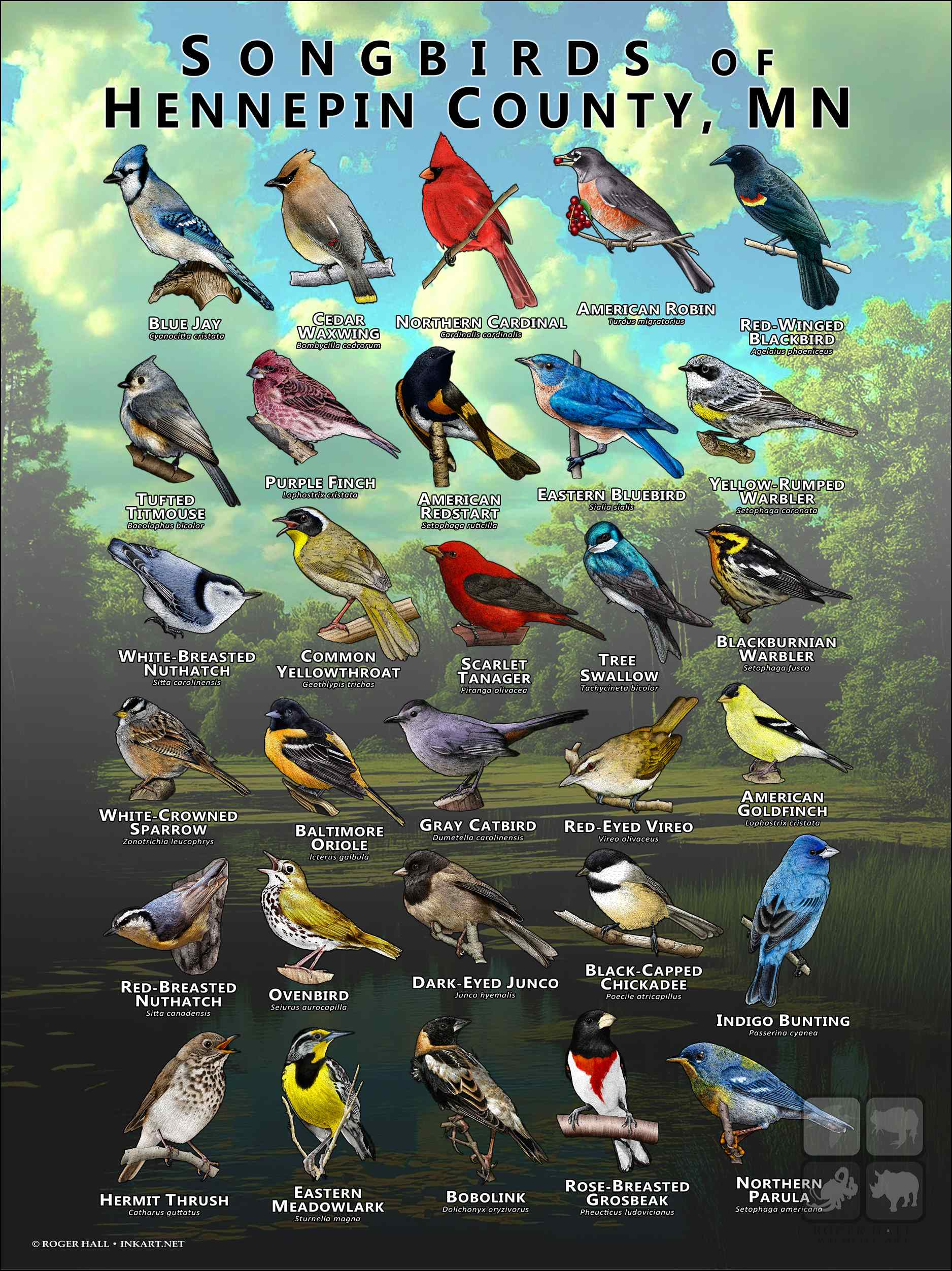 A colorful collage of scientifically accurate illustration of various species of songbird native to Hennepin County in Minnesota
