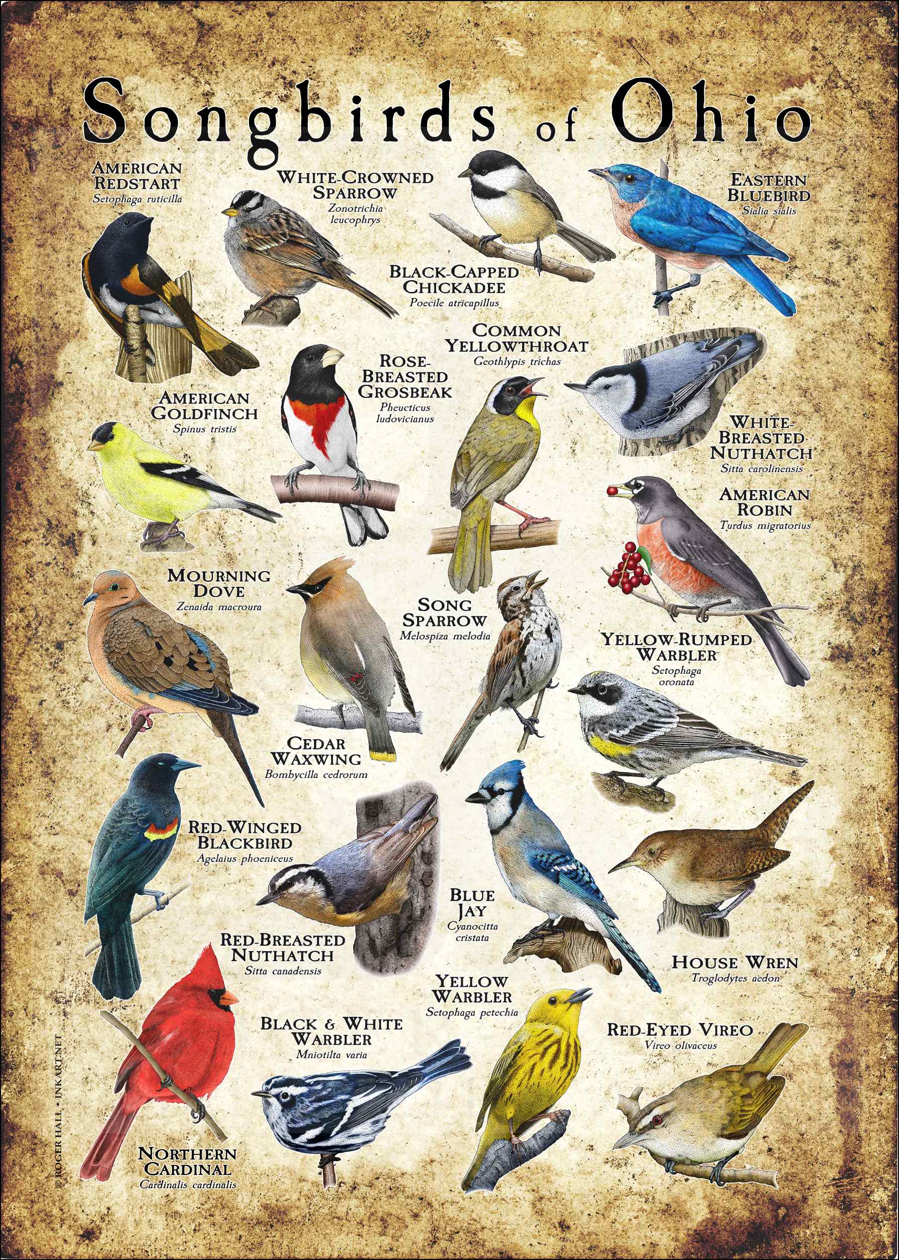 A colorful collage of scientifically accurate illustration of various species of songbird native to Ohio in North America.
