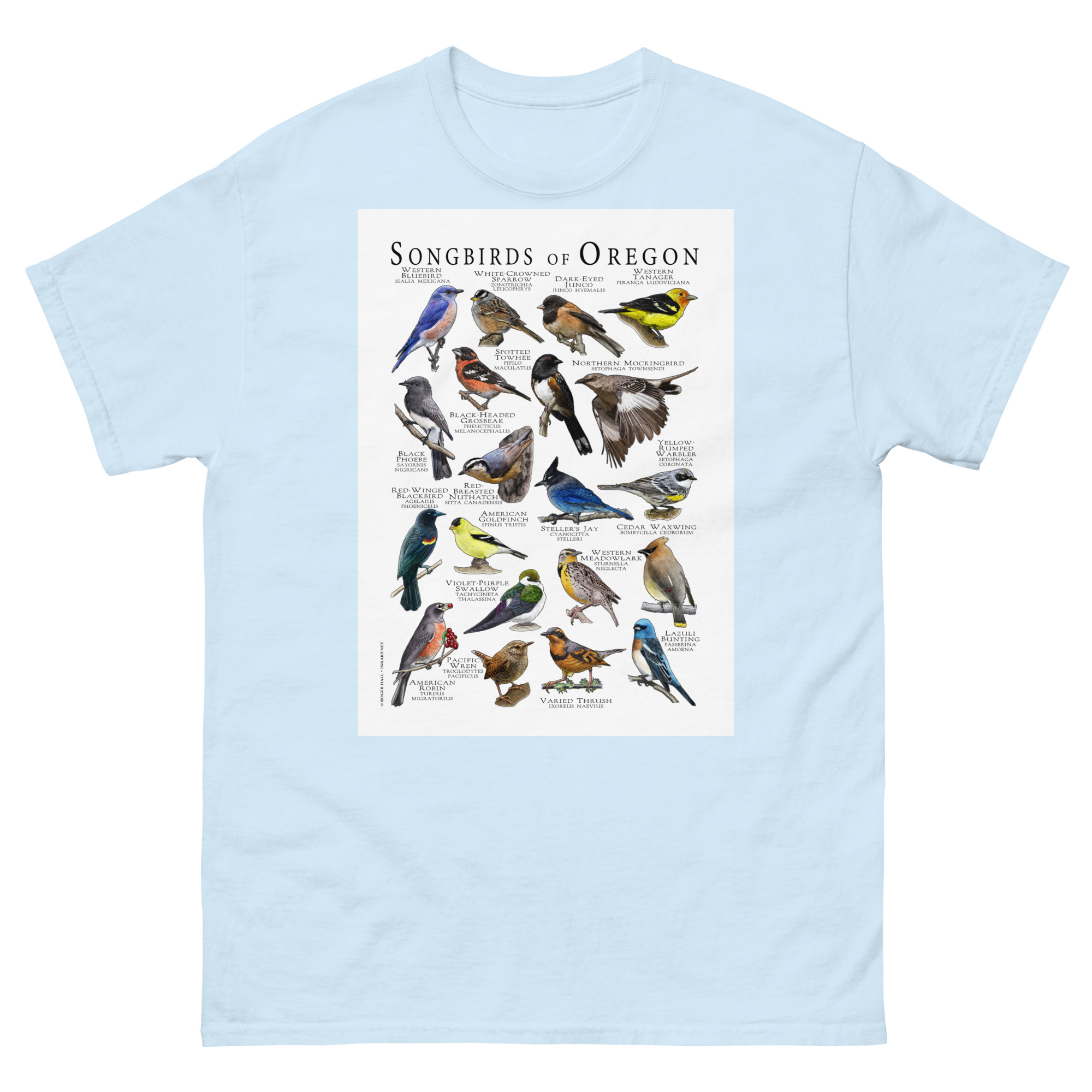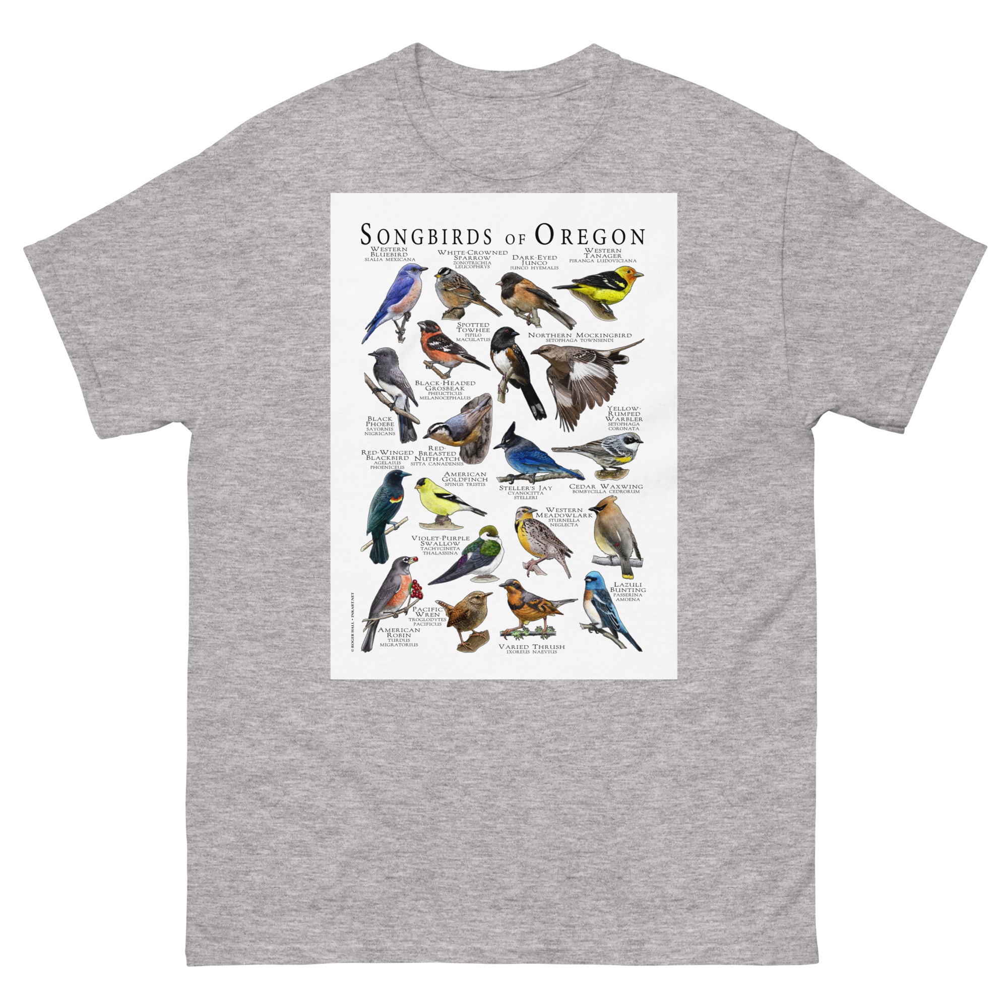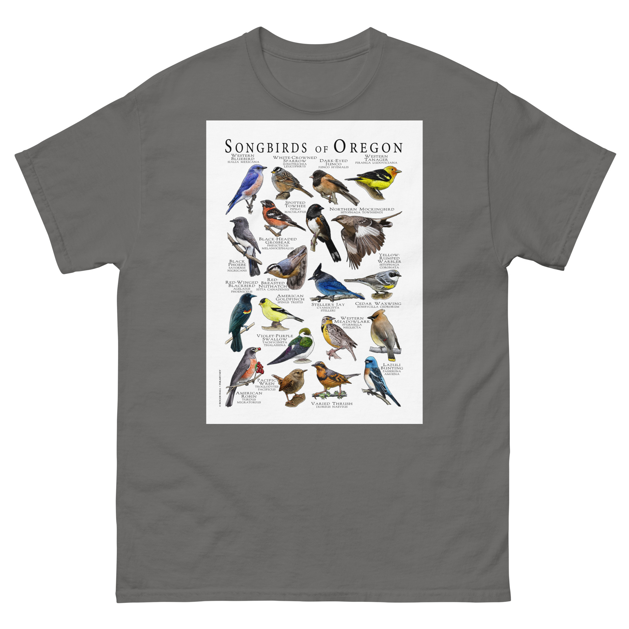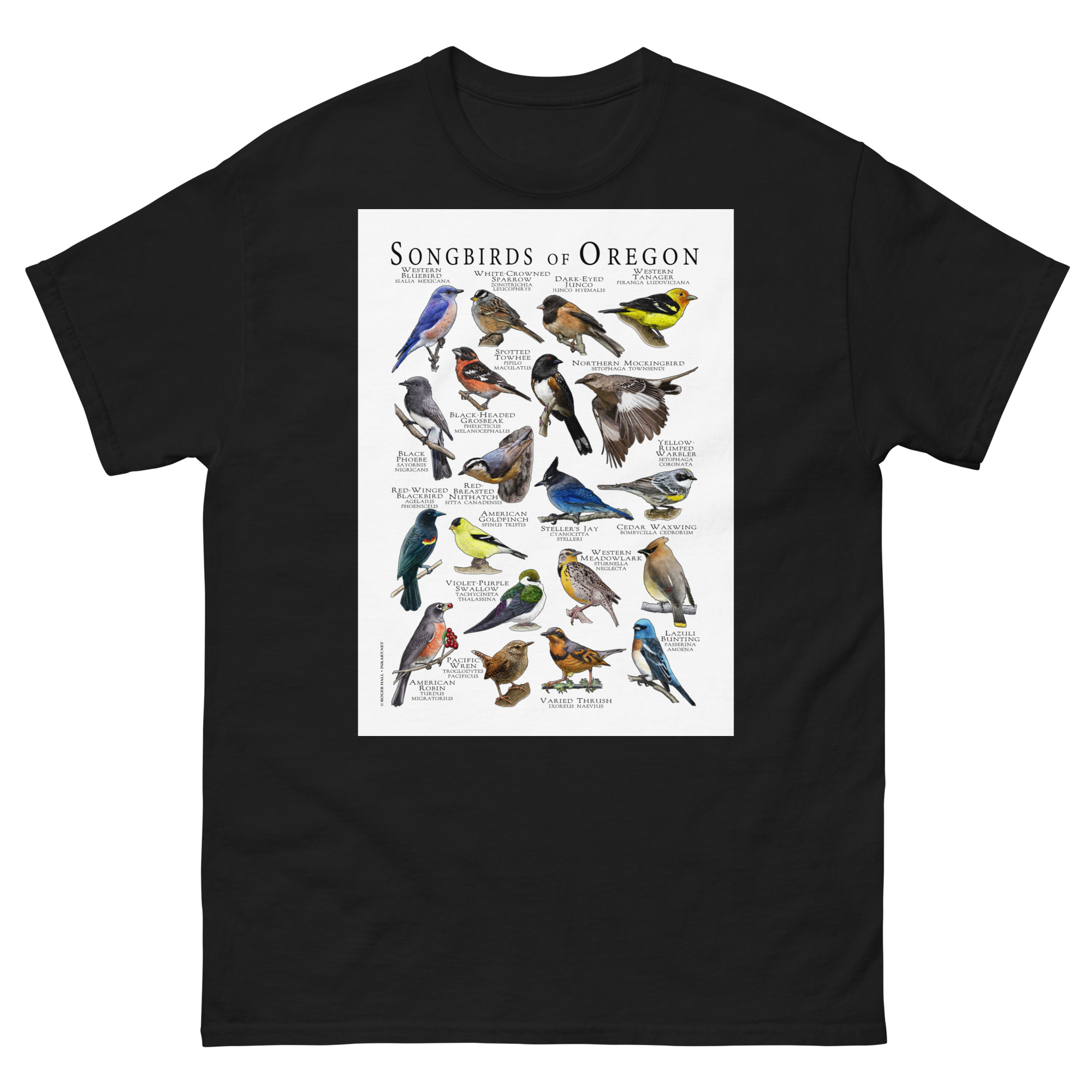 Songbirds – also known as the passerine birds – are any member of the suborder Passeri (or Oscines), of the order Passeriformes. The group including about 4,000 species in 35-55 families, which is nearly half the world’s birds. This artwork features high-quality illustrations of the various species of songbird native to the state of Oregon in the USA. The image is printed on a high-quality 100% men’s cotton t-shirt.