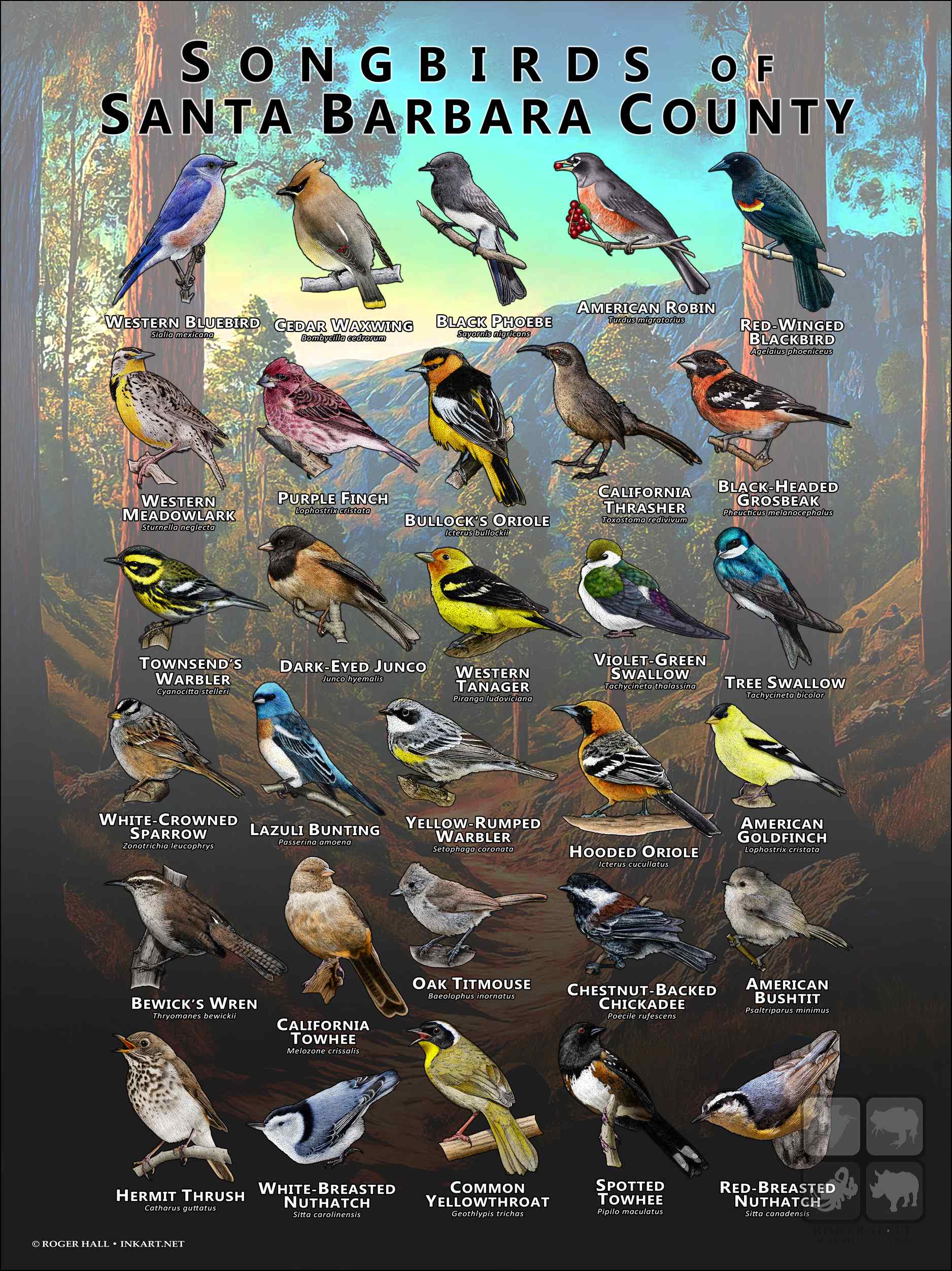 A colorful collage of scientifically accurate illustration of various species of songbird native to Santa Barbara County in Southern California.
