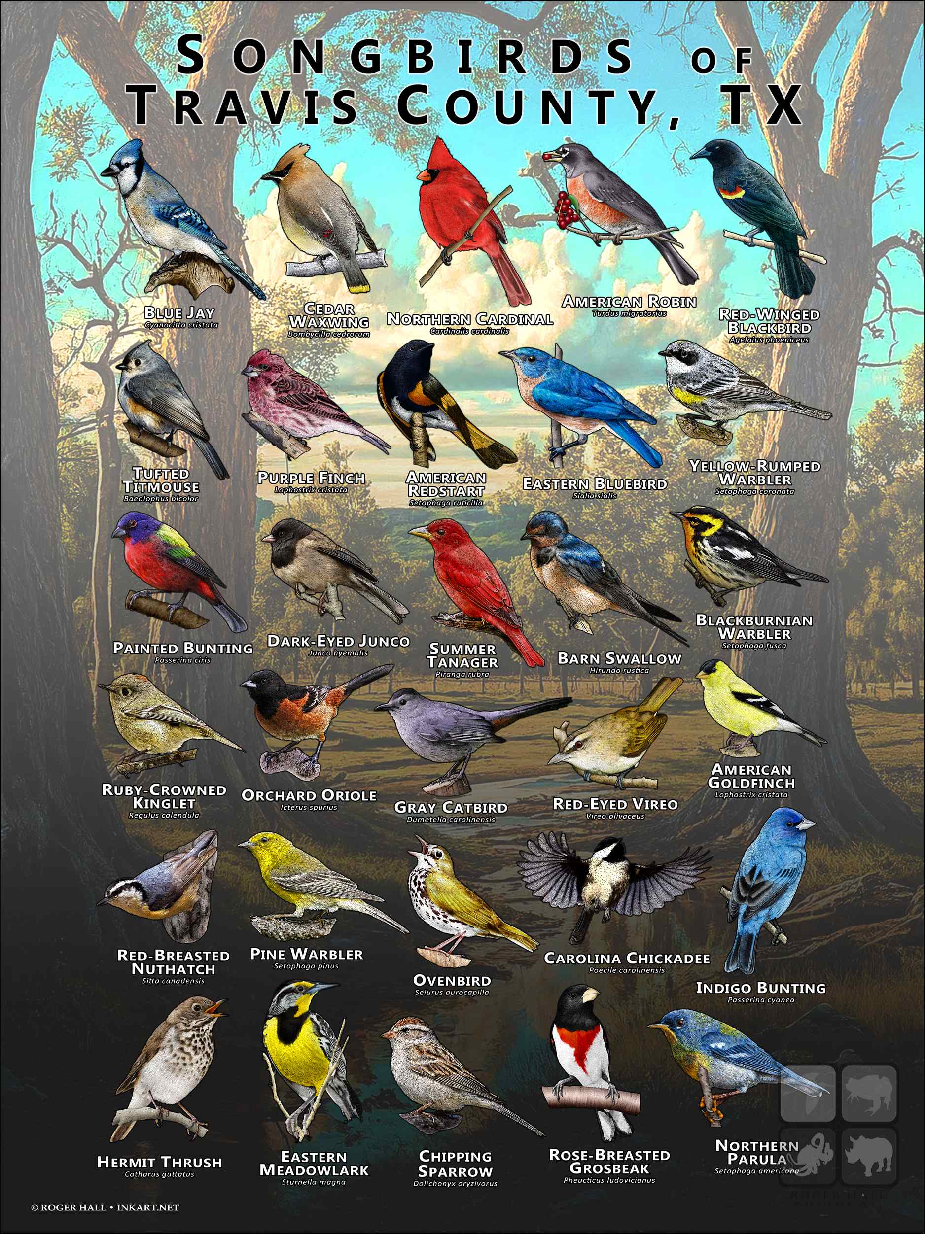 A colorful collage of scientifically accurate illustration of various species of songbird native to Travis County in Texas
