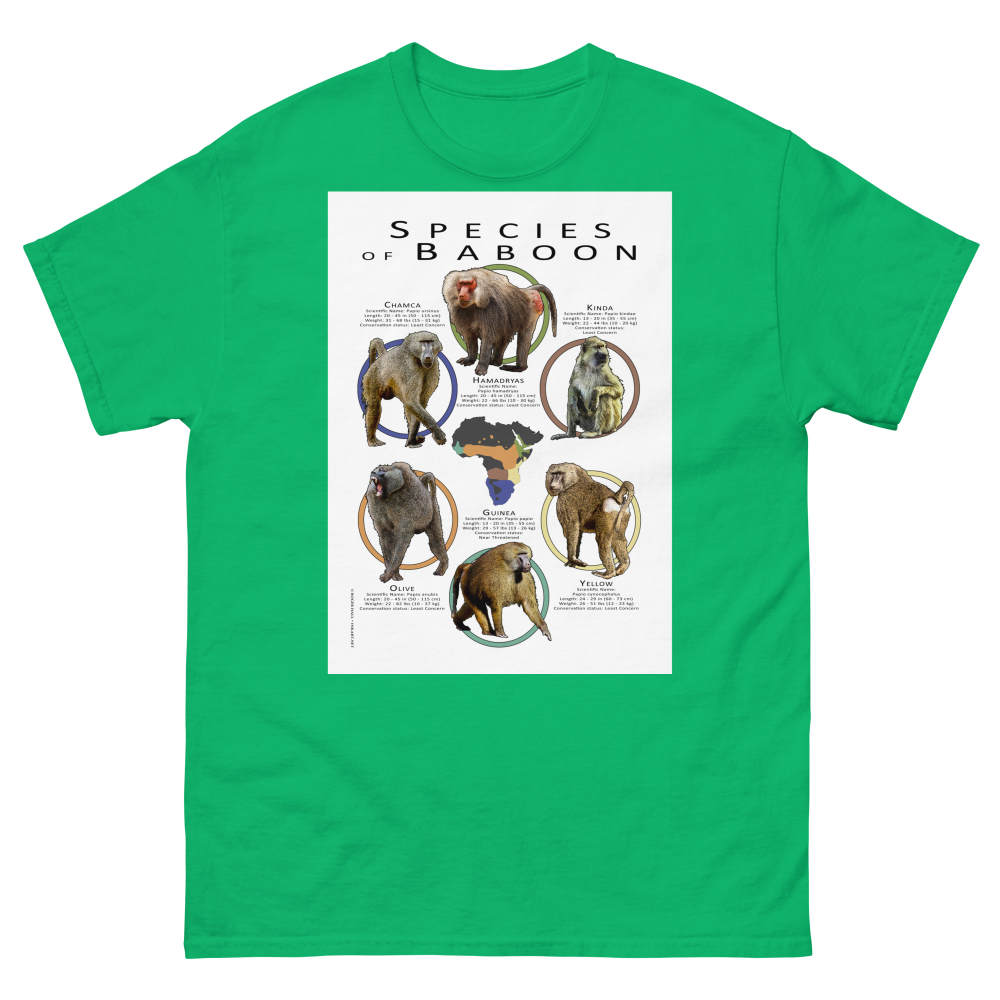 A colorful collage of scientifically accurate illustration of all species of baboon. The image is printed on a high-quality 100% men’s cotton t-shirt.