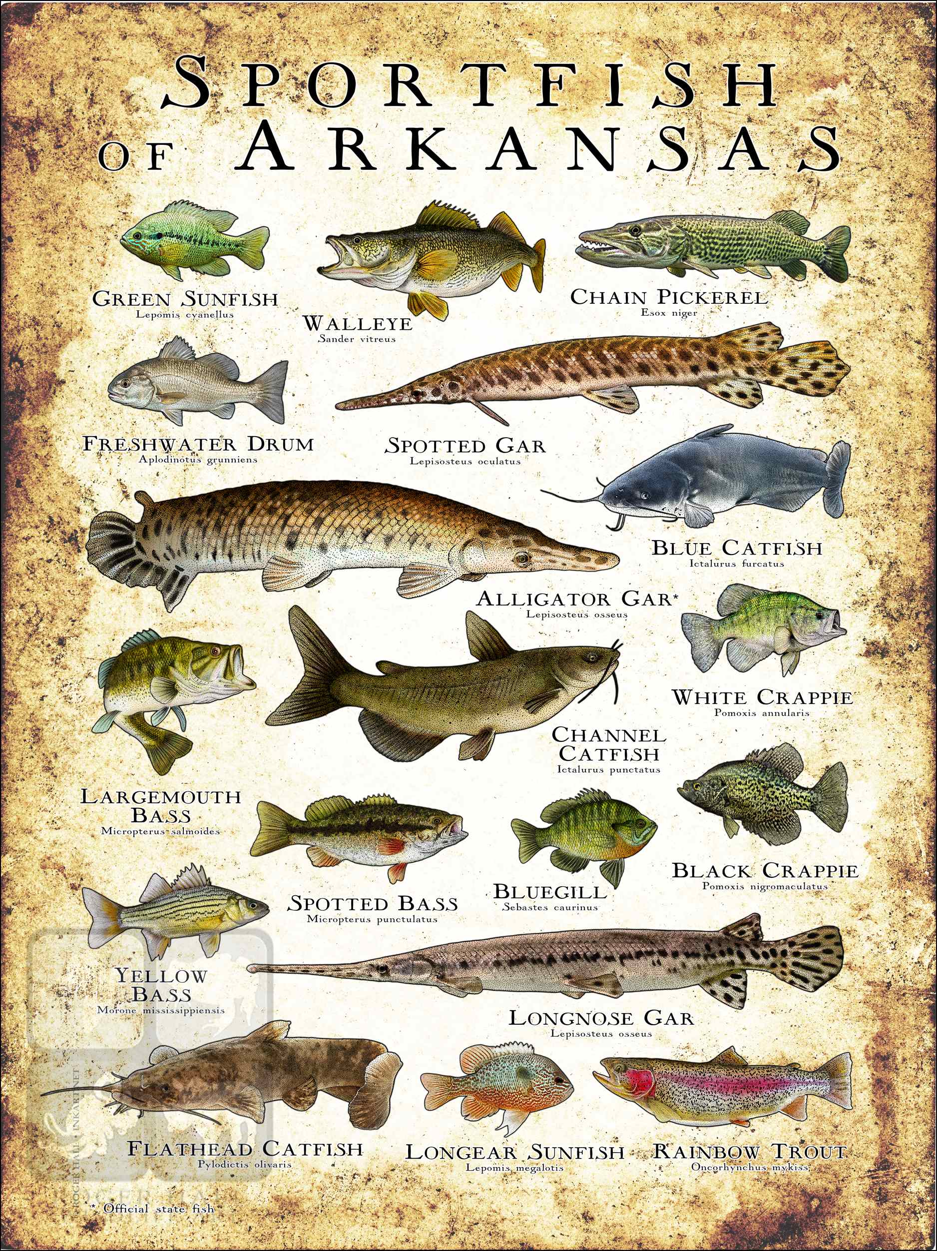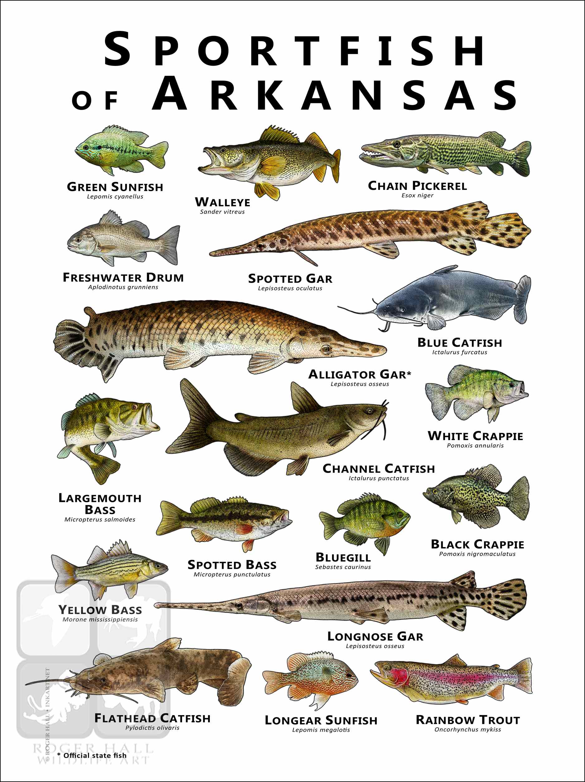 The US state of Arkansas has several different species of sportfish, including such popular types as Walleye, White Crappie, Blue Catfish and the state’s official fish – the Alligator Gar. Here are some select species printed on a colorful, high quality poster. All images are drawn beautifully and with amazing scientific accuracy.