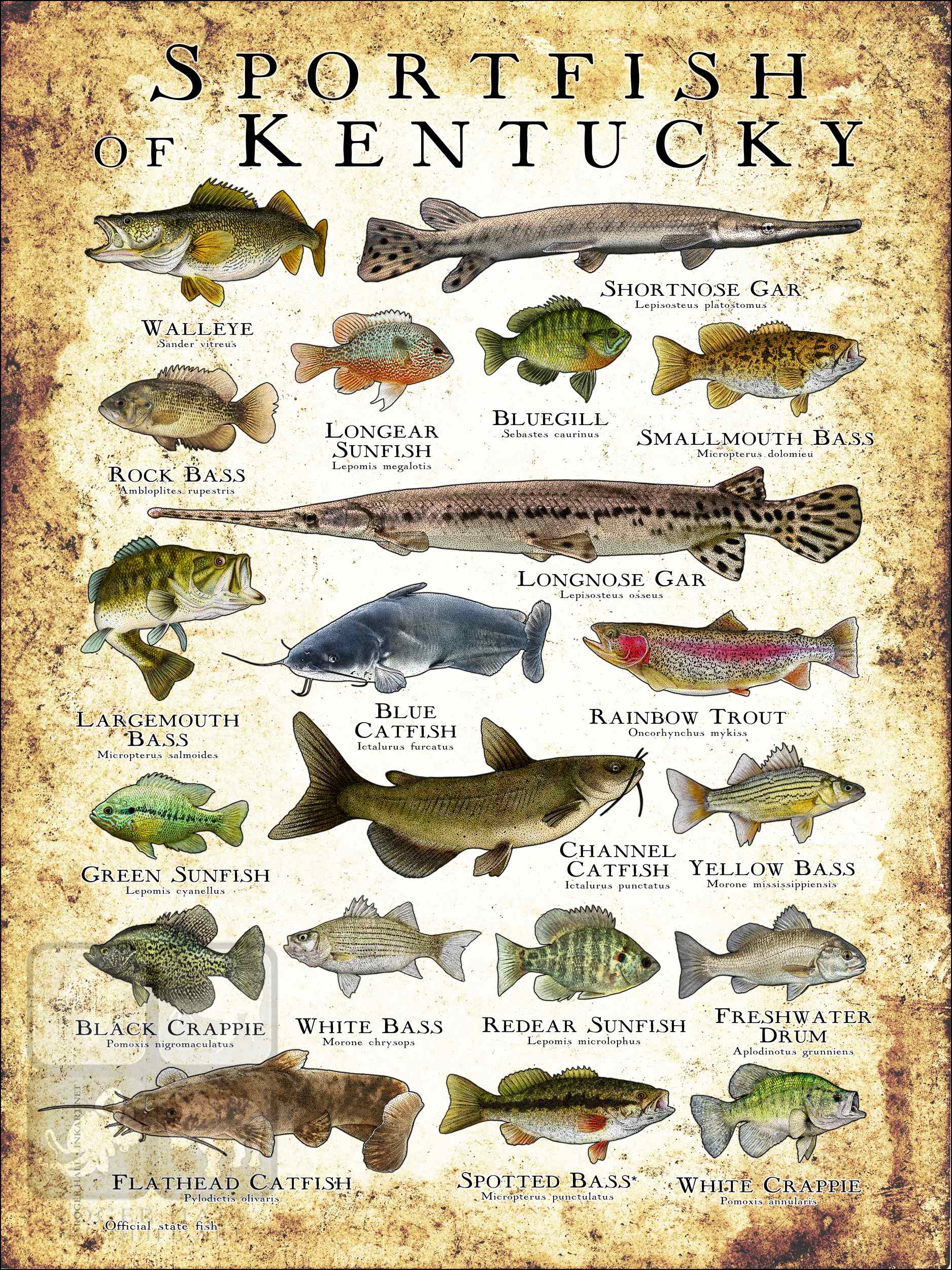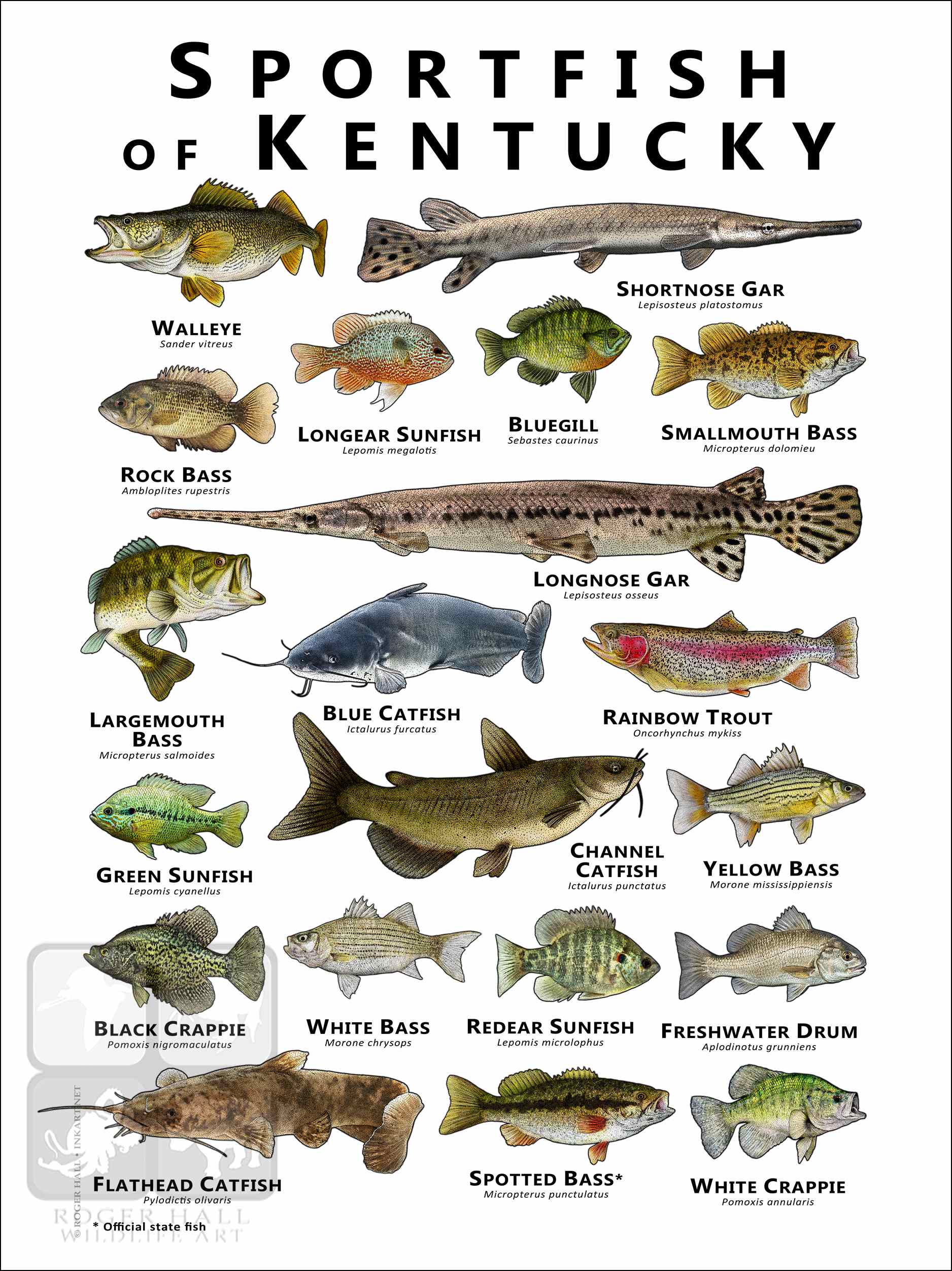 The US state of Kentucky has several different species of sportfish, including such popular types as Walleye, White Crappie, Spotted Bass (the official state fish) and Channel Catfish. Here are some select species printed on a colorful, high quality poster. All images are drawn beautifully and with amazing scientific accuracy.