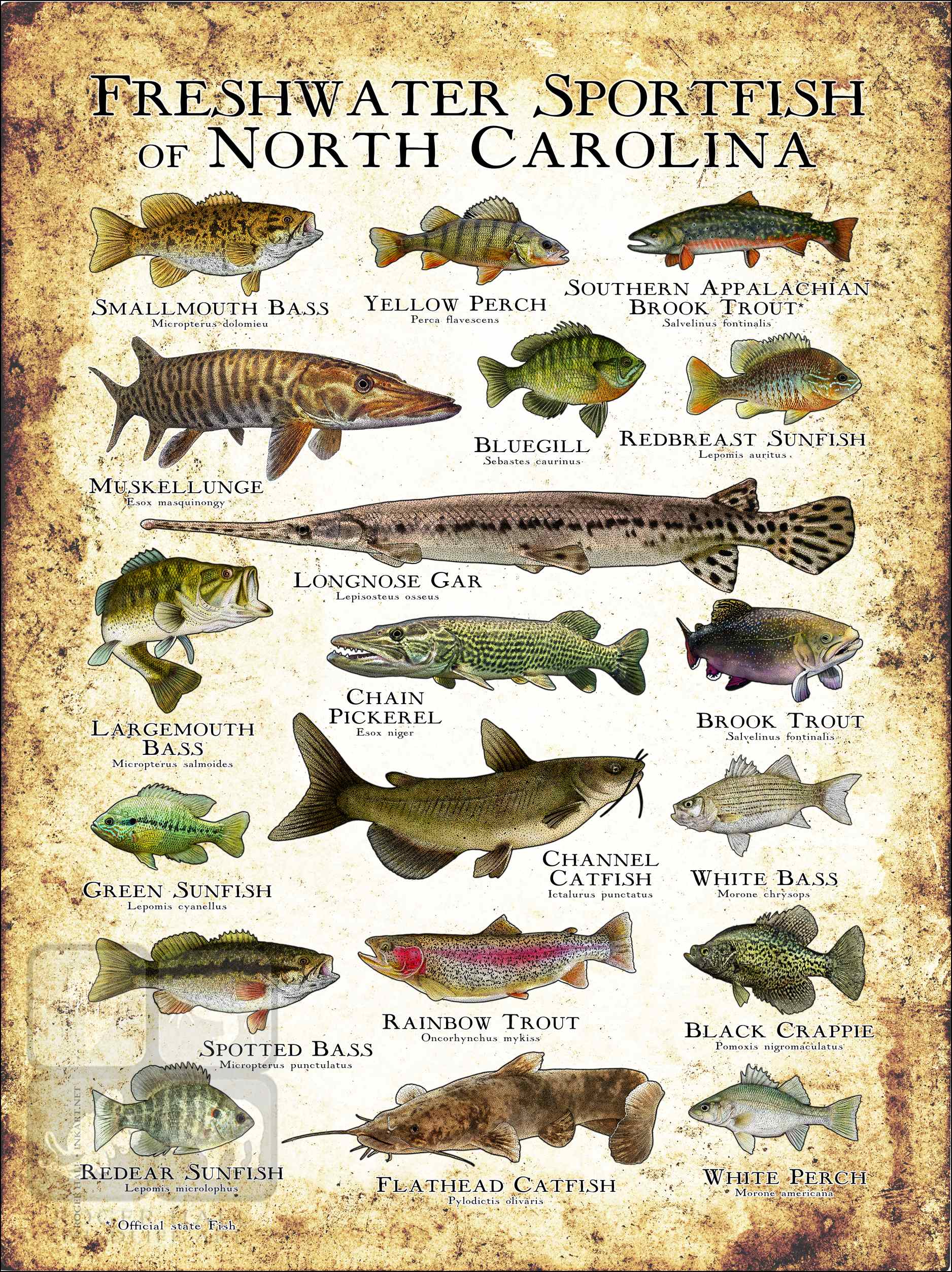 The US state of North Carolina has several different native species of sportfish, including such popular species as Chain Pickerel, Brook Trout, Muskellunge and Flathead Catfish. Here are some selected species printed on a colorful, high quality poster. All images are drawn beautifully and with amazing scientific accuracy.