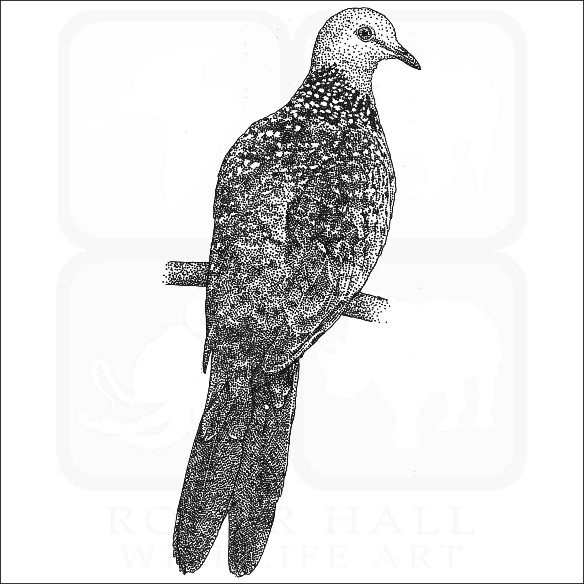 Fine art illustration of a Spotted Dove (Spilopelia chinensis.) The illustration is available in black and white or color.