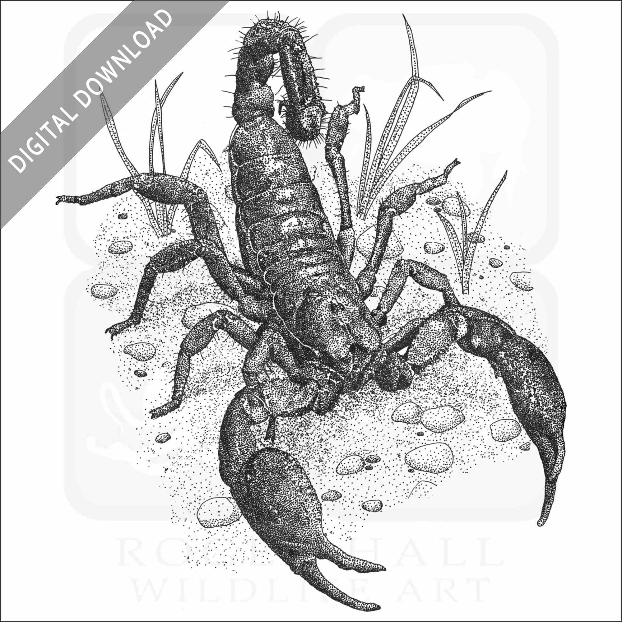 Stock art illustration of an Asian Forest Scorpion (Nebo hierichonticus.) The illustration is available in black and white or color for immediate download.