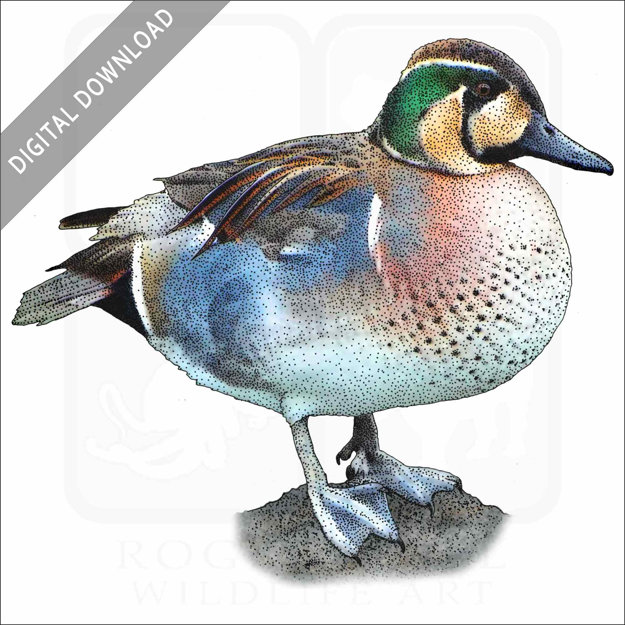 Stock art illustration of a Baikal Teal – 0r Bimaculate or Squawk Duck – (Sibirionetta formosa.)Â The illustration is available in black and white or color for immediate download.