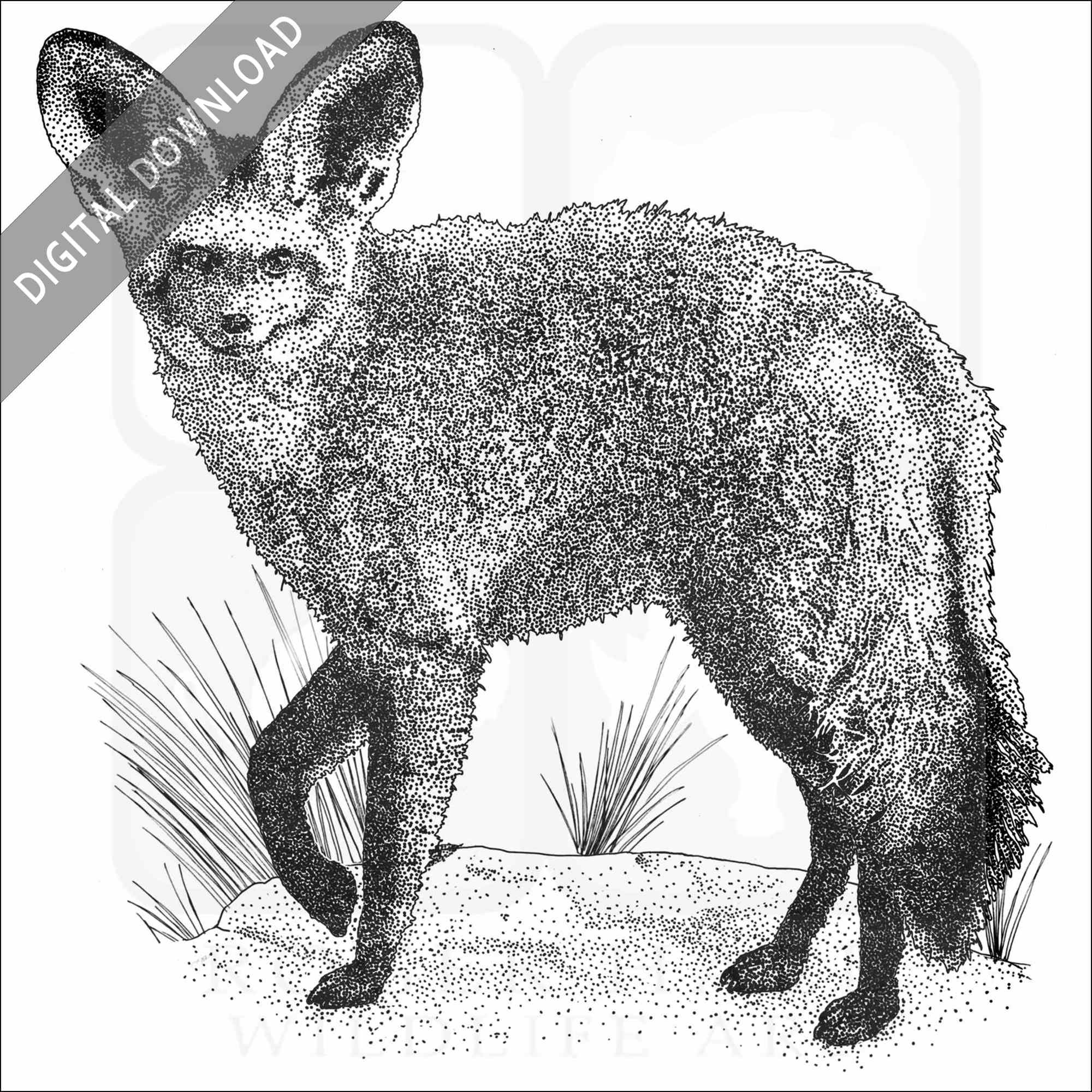 Stock art illustration of a Bat-Eared Fox (Otocyon megalotis.)Â The illustration is available in black and white or color for immediate download.