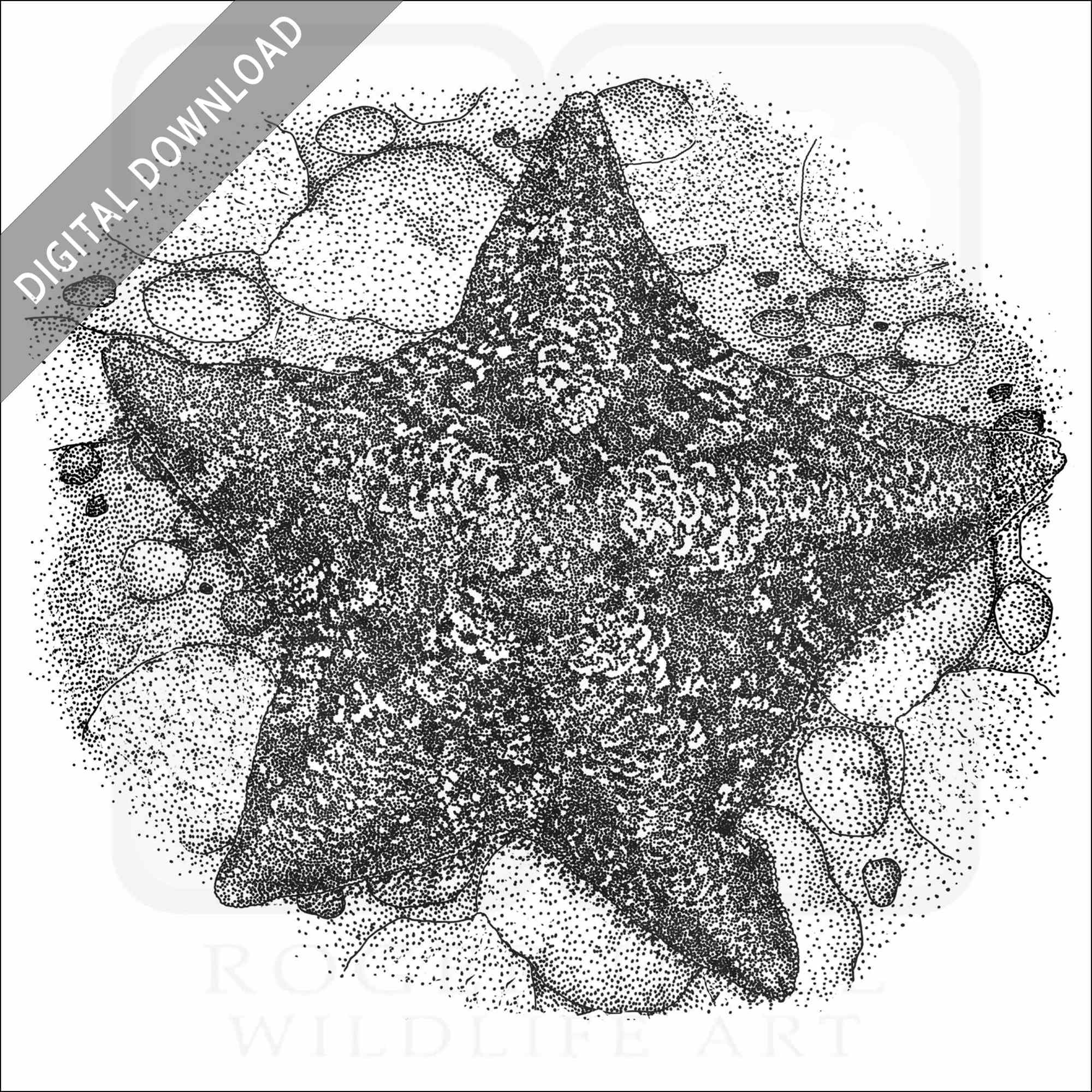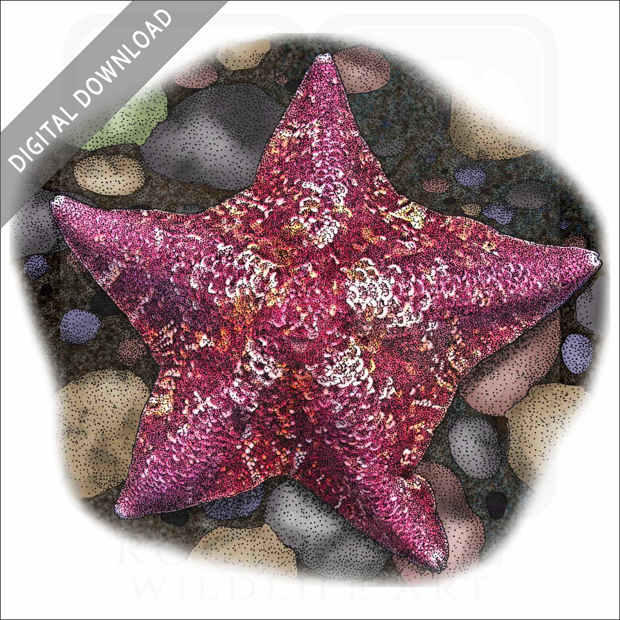 Stock art illustration of a Bat Star (Asterina miniata.) The illustration is available in black and white or color for immediate download.