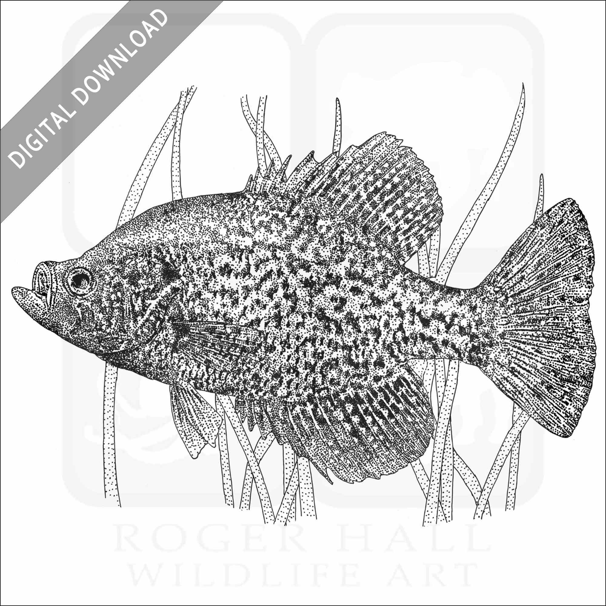 Stock art illustration of a Black Crappie (Pomoxis nigromaculatus.)Â The illustration is available in black and white or color for immediate download.