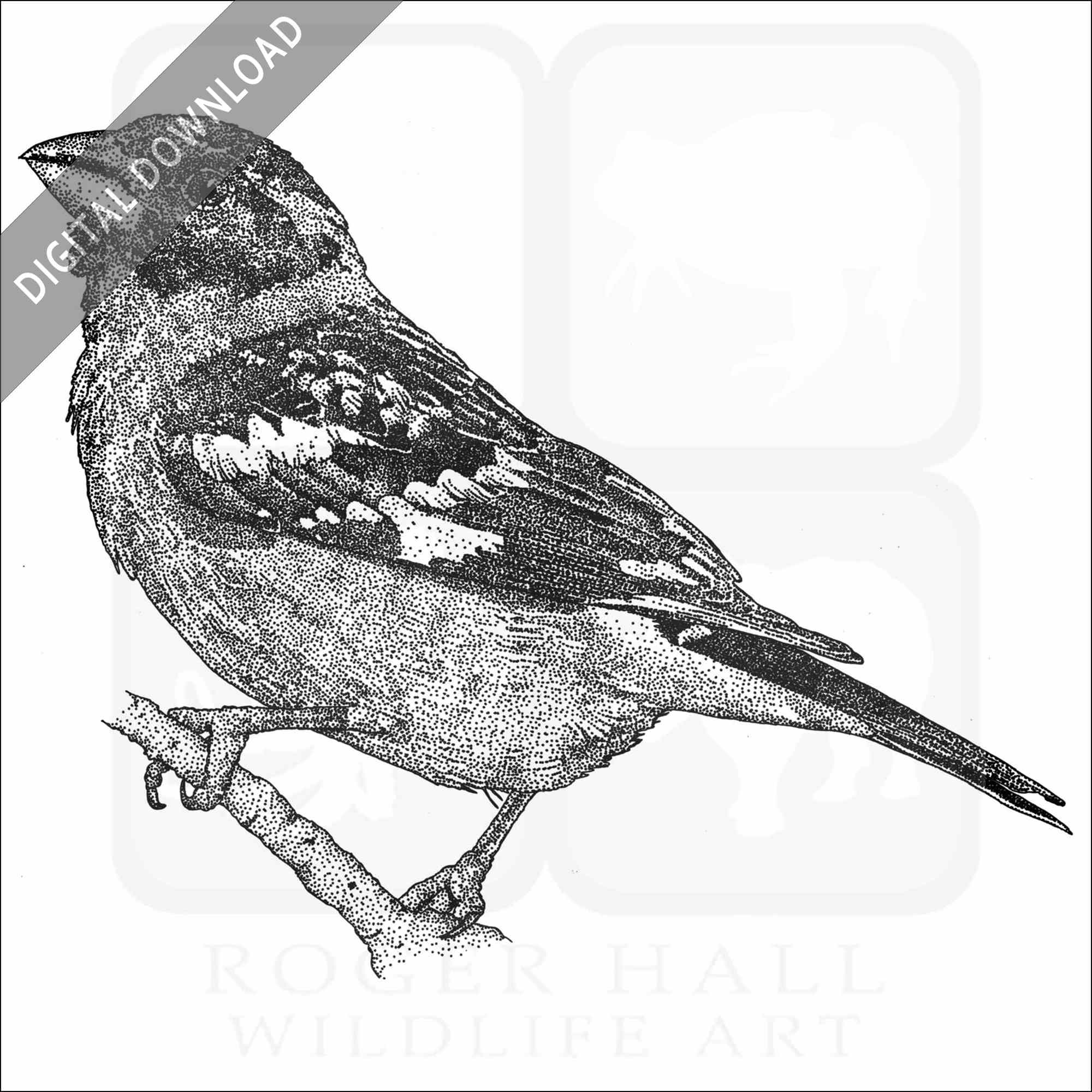 Stock art illustration of a Black-Headed Grosbeak (Pheucticus melanocephalus.) The illustration is available in black and white or color for immediate download.
