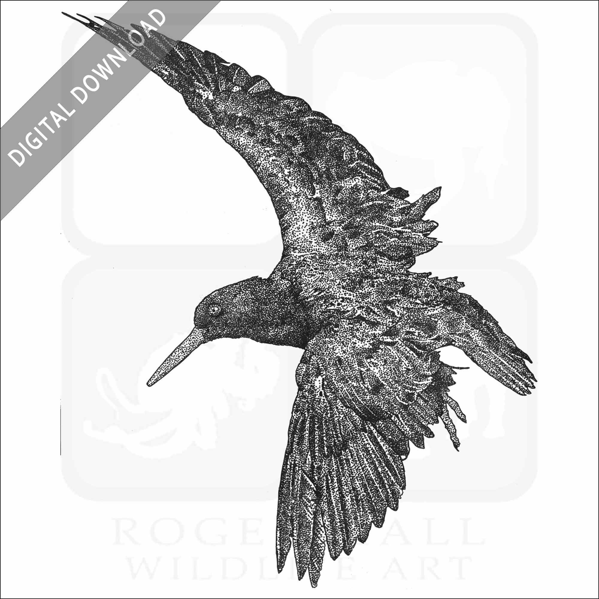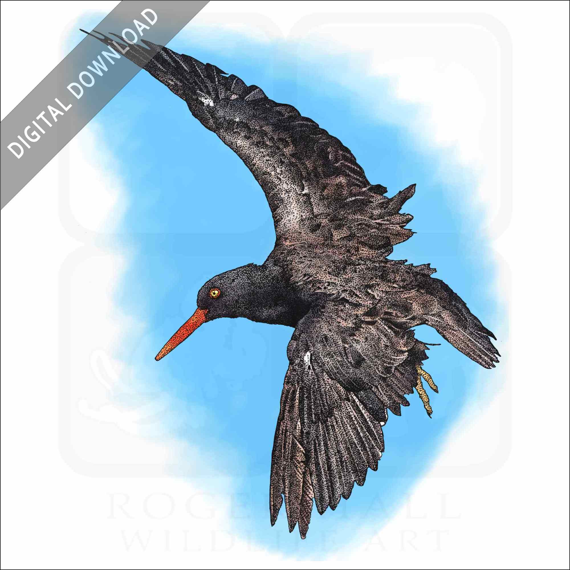 Stock art illustration of a Black Oystercatcher (Haematopus bachmani.) The illustration is available in black and white or color for immediate download.