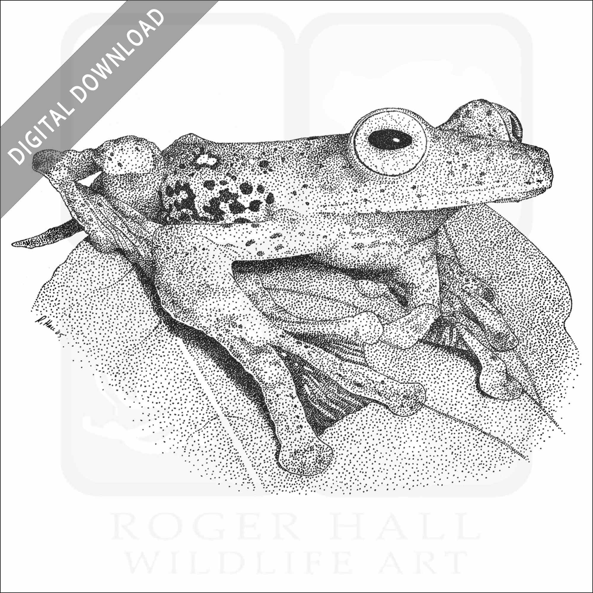 Stock art illustration of a Borneo Red Flying Frog (Rhacophorus pardalis.) The illustration is available in black and white or color for immediate download.