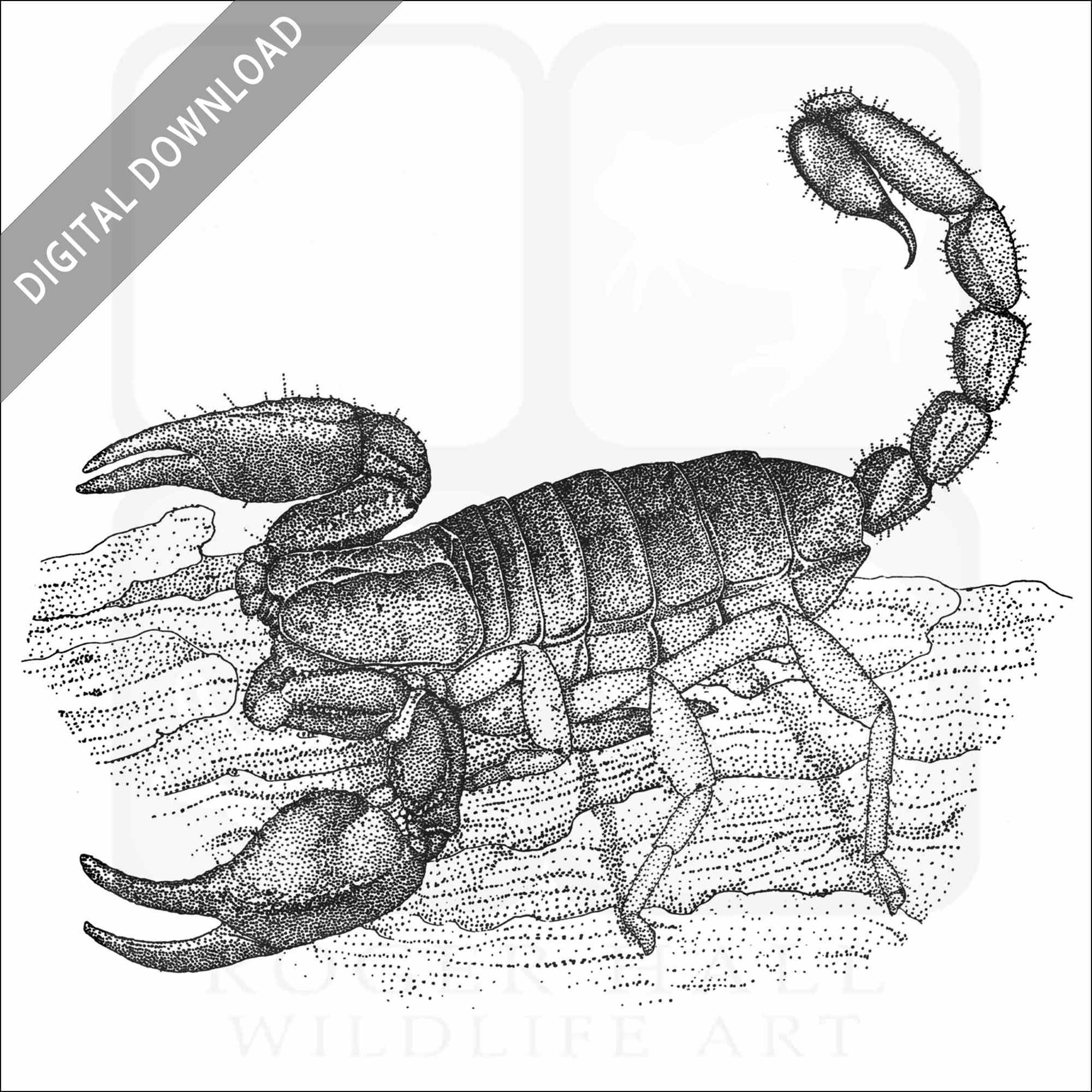 Stock art illustration of a California Forest Scorpion (Uroctonus mordax.)Â The illustration is available in black and white or color for immediate download.