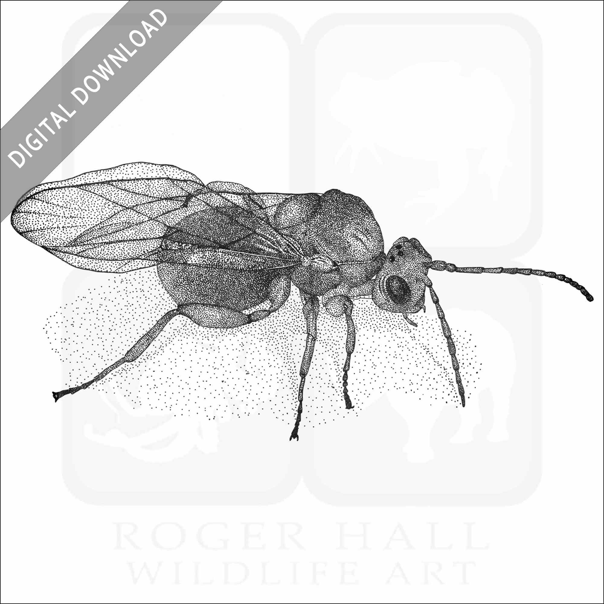 Stock art illustration of a California Gall Wasp (Andricus quercuscalifornicus.)Â The illustration is available in black and white or color for immediate download.