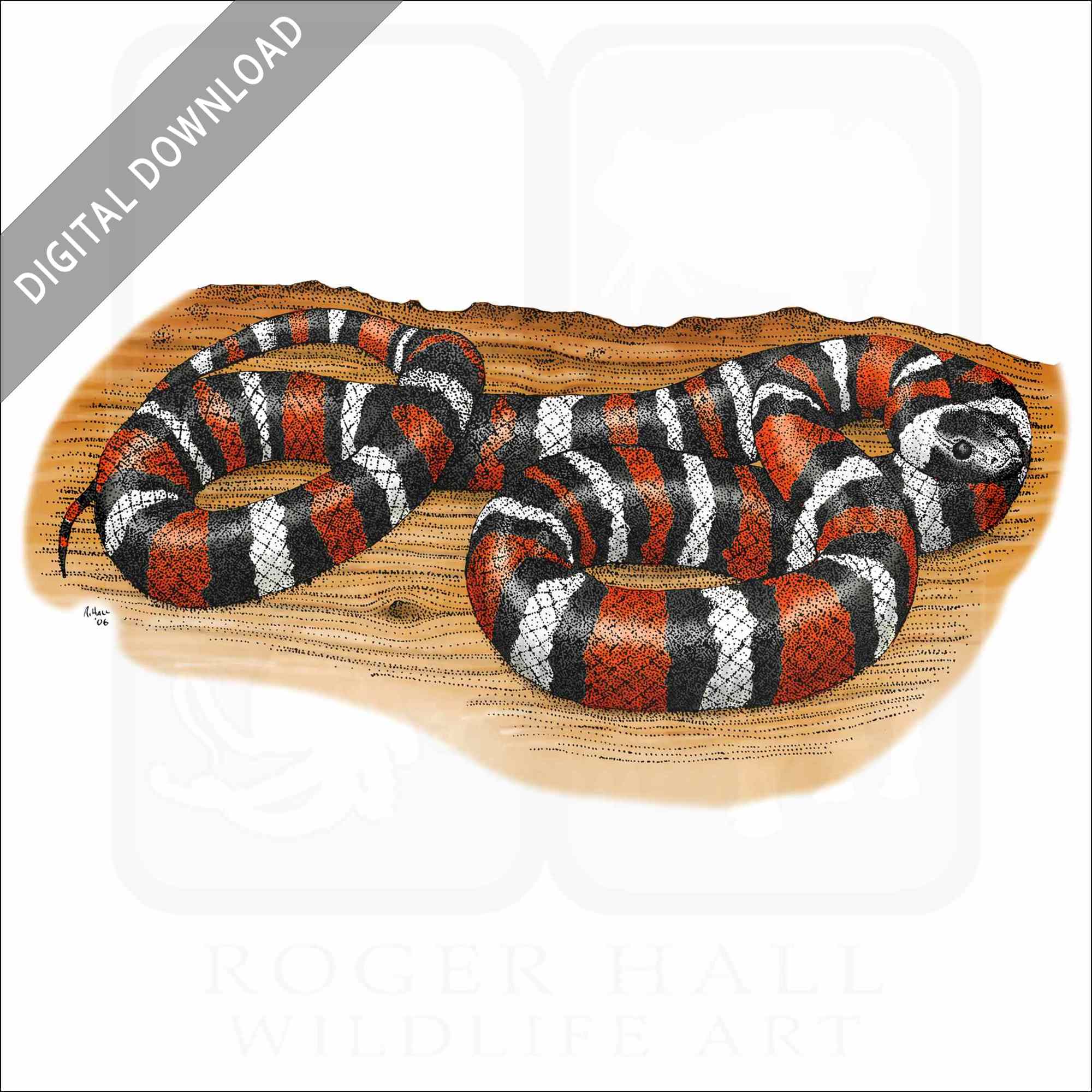 Stock art illustration of a California Mountain Kingsnake (Lampropeltis zonata.) The illustration is available in black and white or color for immediate download.