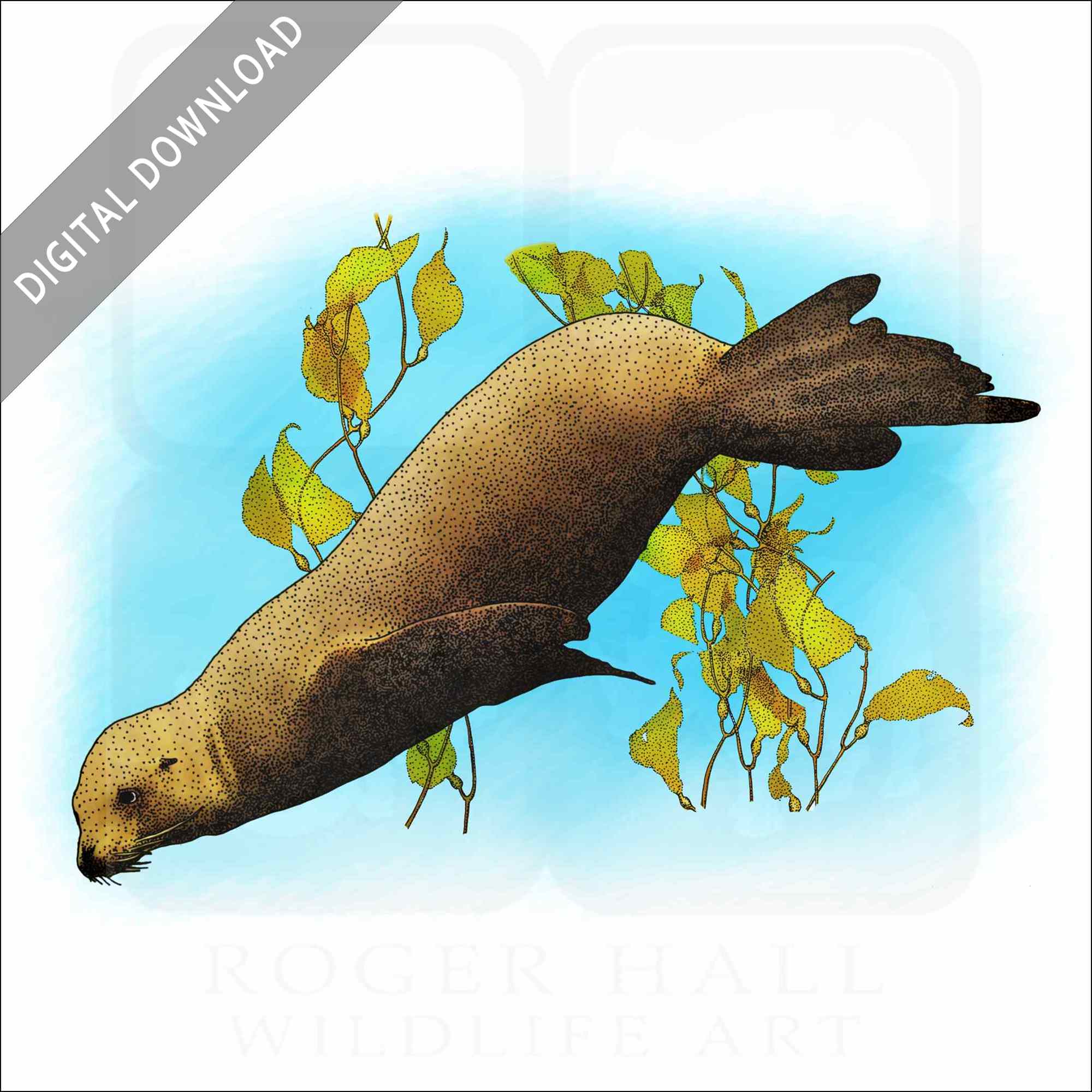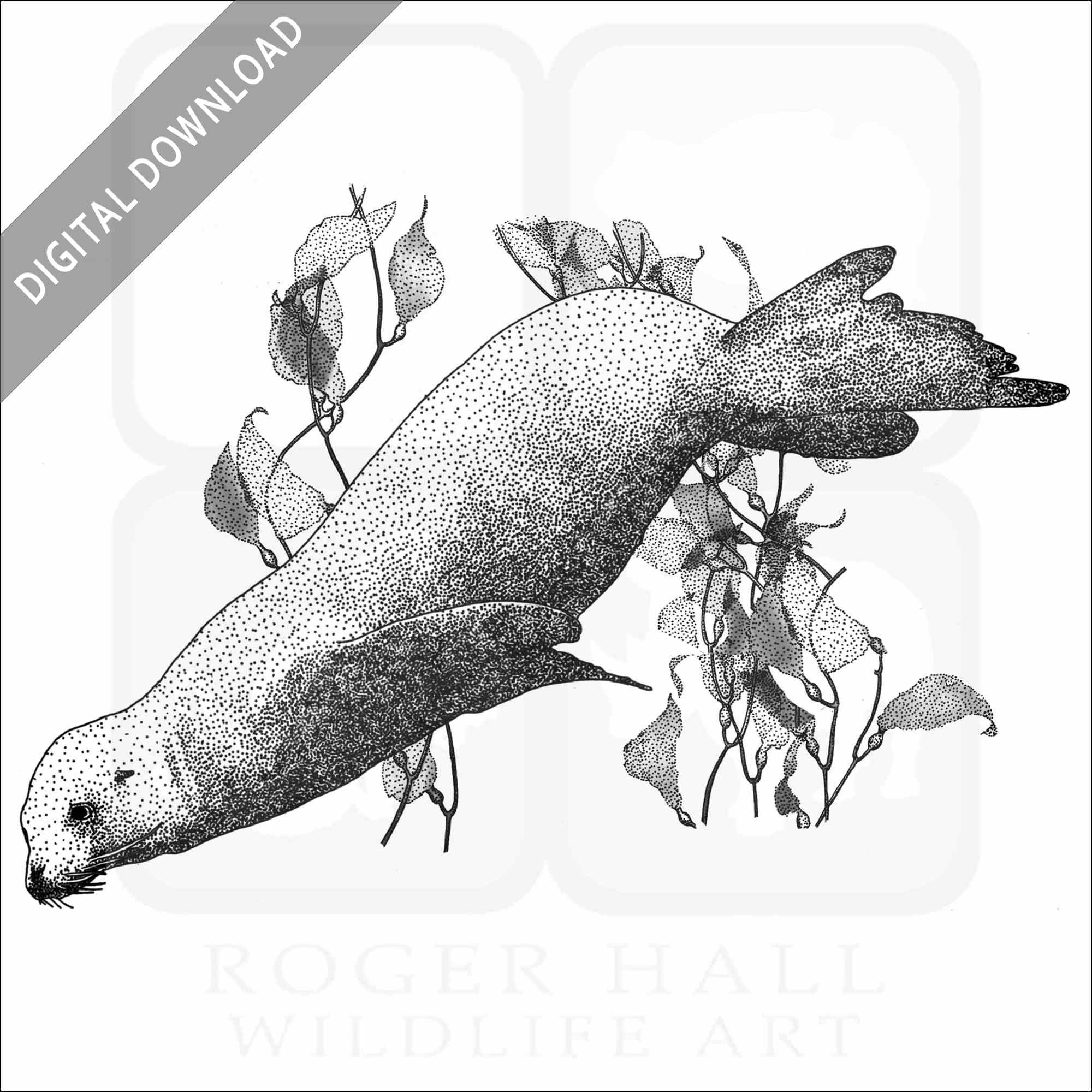 Stock art illustration of a California Sea Lion (Zalophus californianus.) The illustration is available in black and white or color for immediate download.