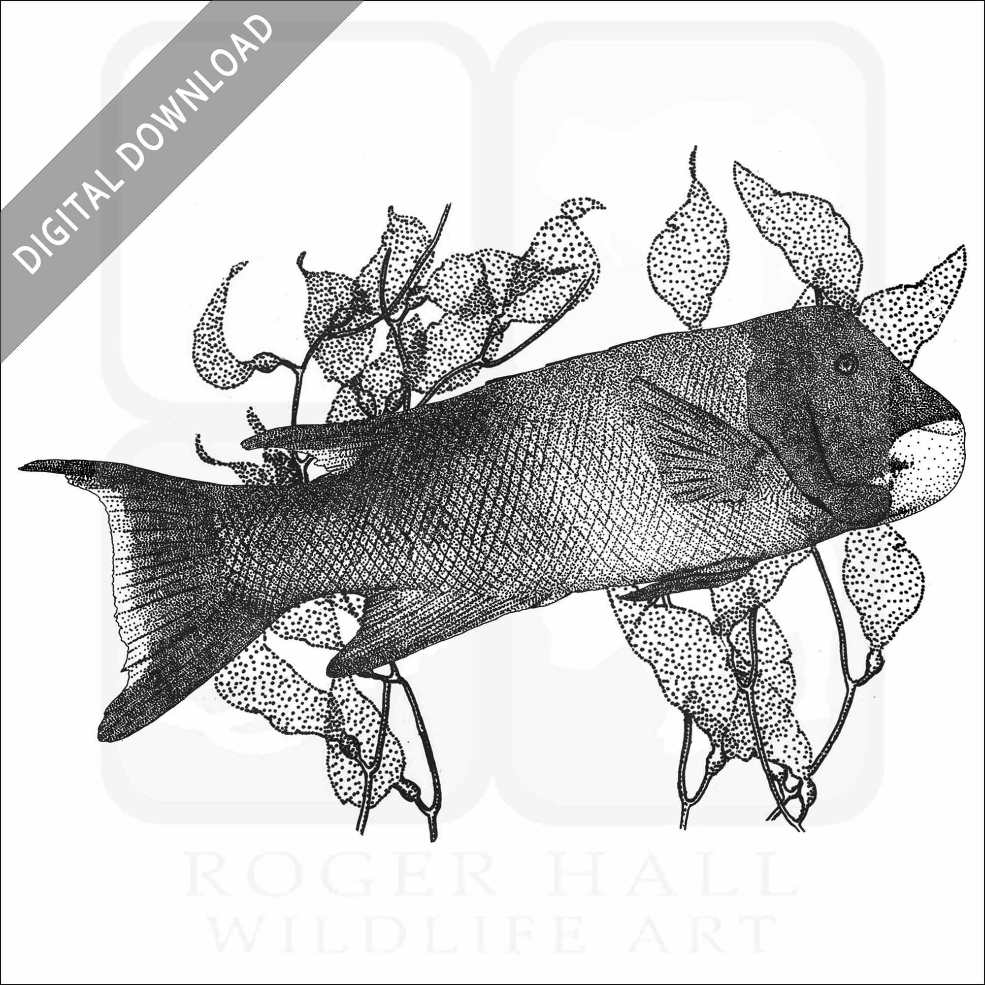 Stock art illustration of a California Sheephead (Semicossyphus pulcher.) The illustration is available in black and white or color for immediate download.