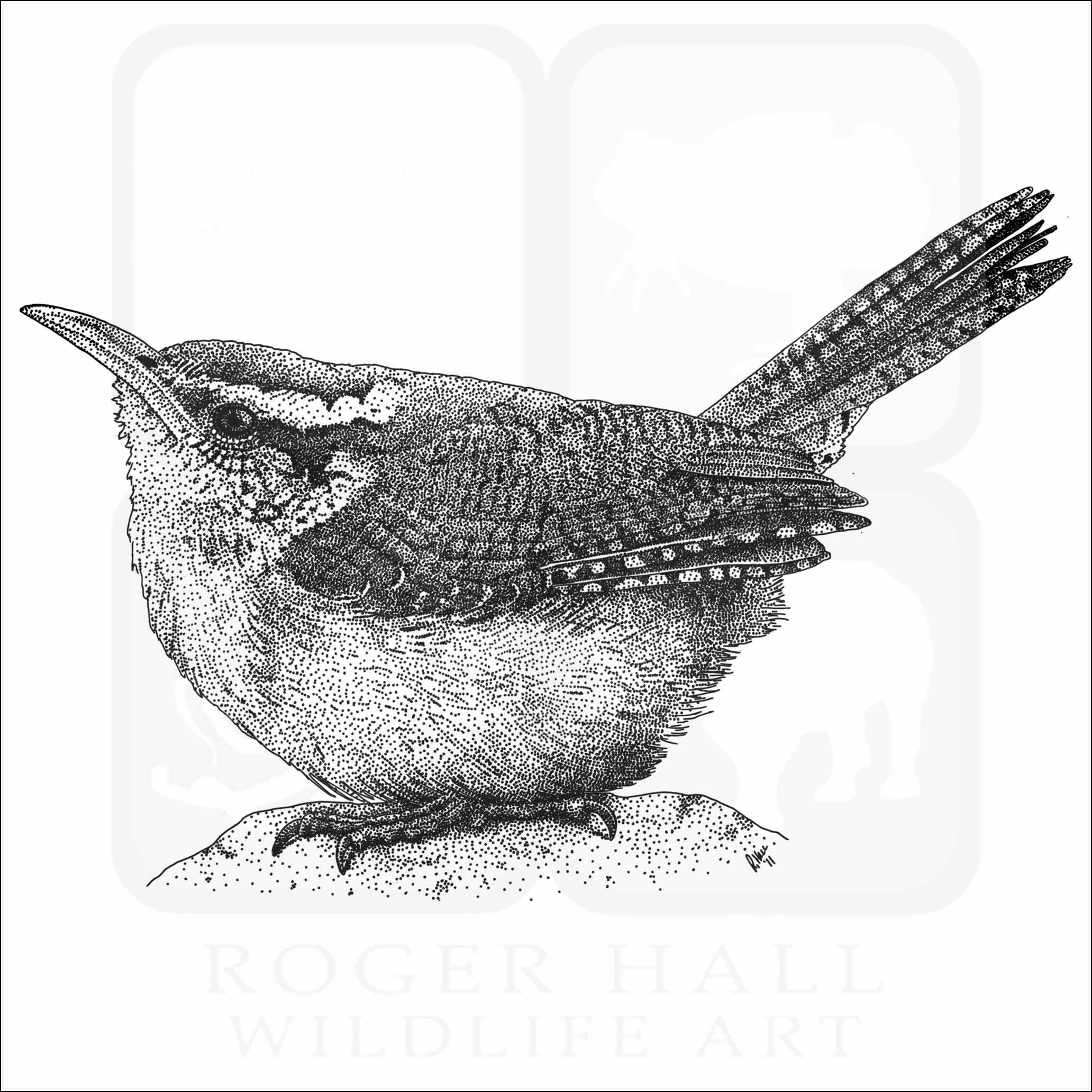 Fine art illustration of a Carolina Wren (Thryothorus ludovicianus.) The illustration is available in black and white or color.