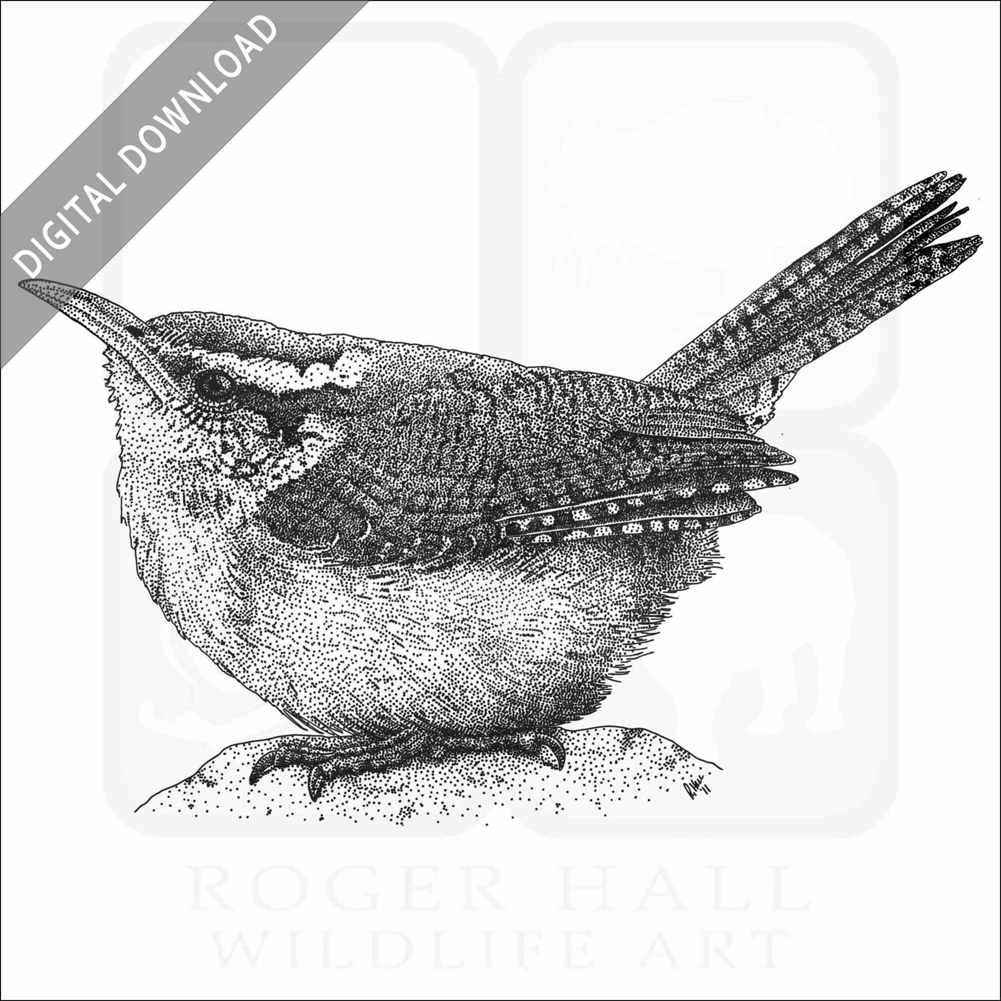 Stock art illustration of a Carolina Wren (Thryothorus ludovicianus.) The illustration is available in black and white or color for immediate download.