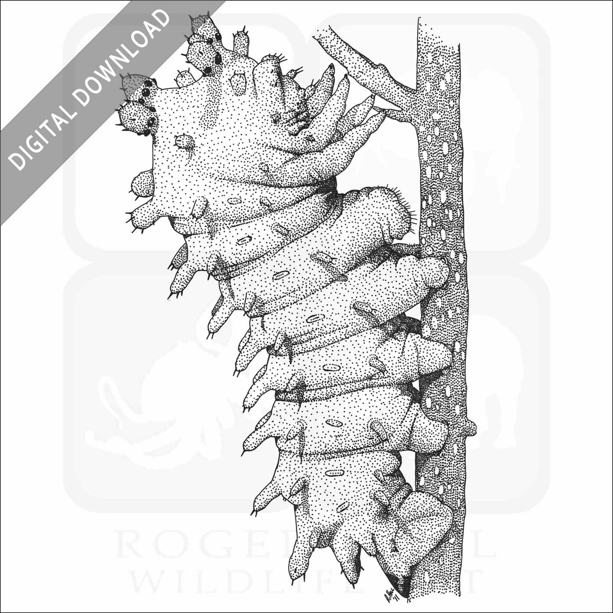 Stock art illustration of a Cecropia Moth Caterpillar (Hyalophora cecropia.) The illustration is available in black and white or color for immediate download.