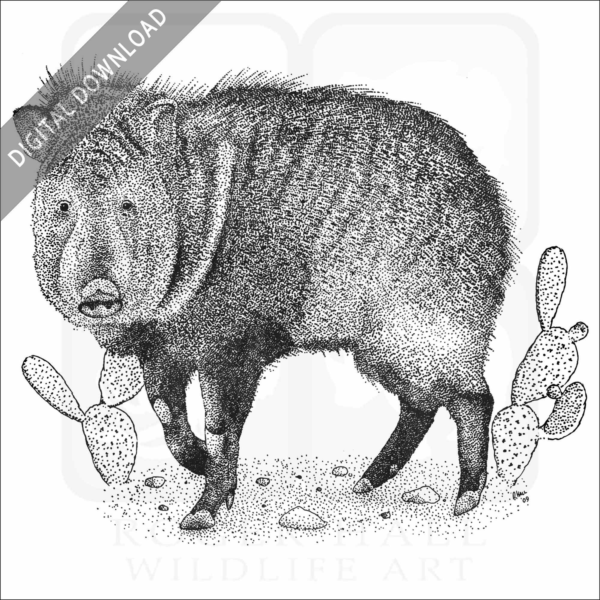 Stock art illustration of a Collared Peccary or Javelina (Pecari tajacu.)Â The illustration is available in black and white or color for immediate download.