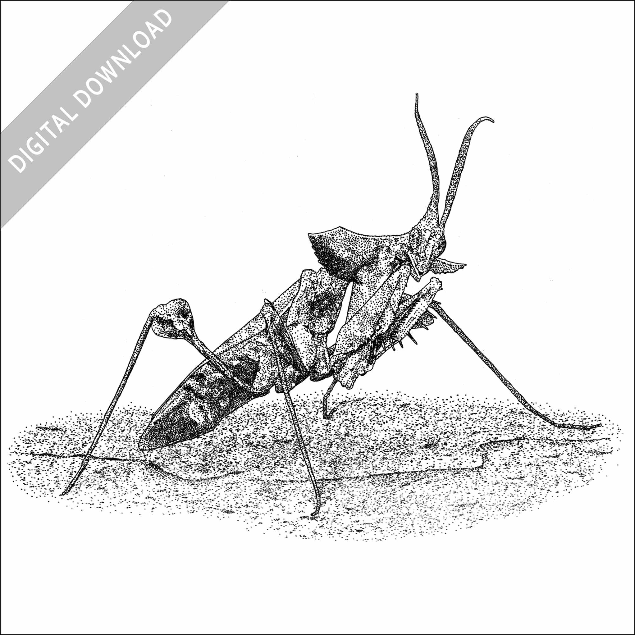 Stock art illustration of a Devil’s Flower Mantis (Idolomantis diabolica.)Â The illustration is available in black and white or color for immediate download.