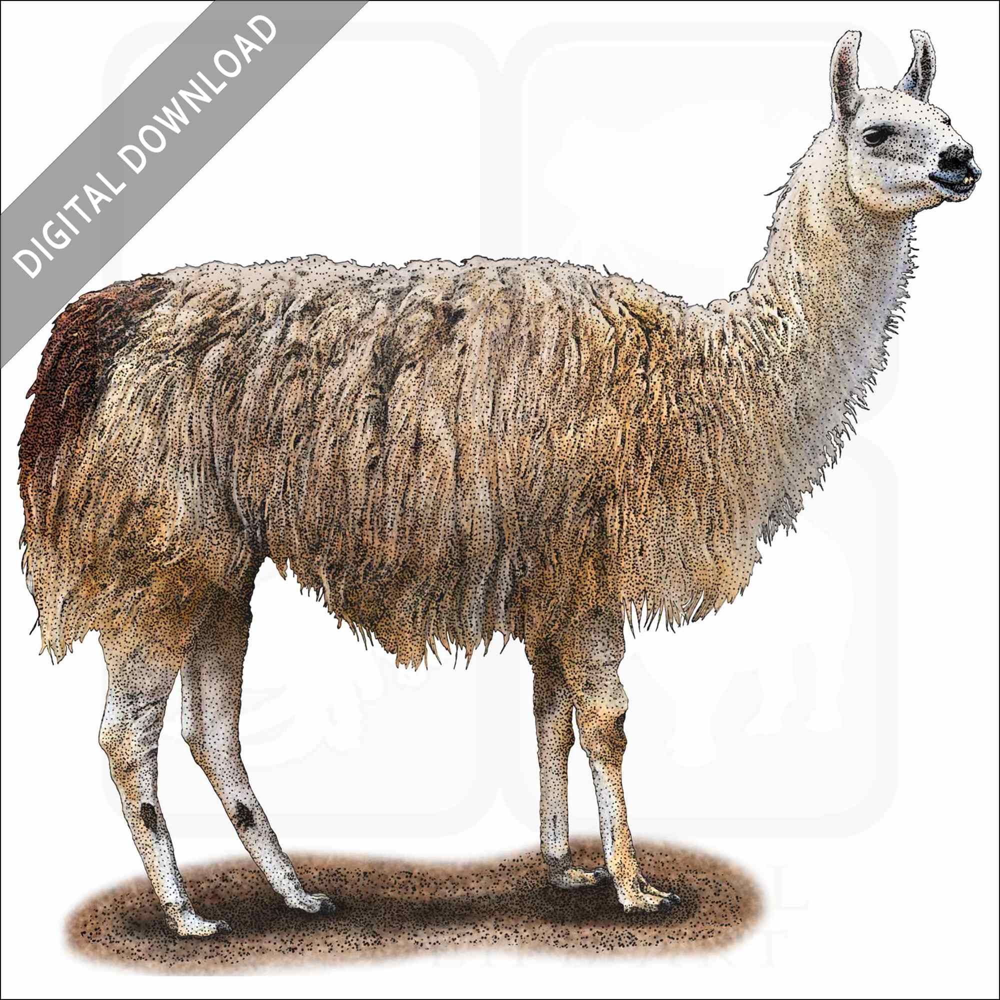 Stock art illustration of a Domestic Llama (Lama guanicoe glama.) The illustration is available in black and white or color for immediate download