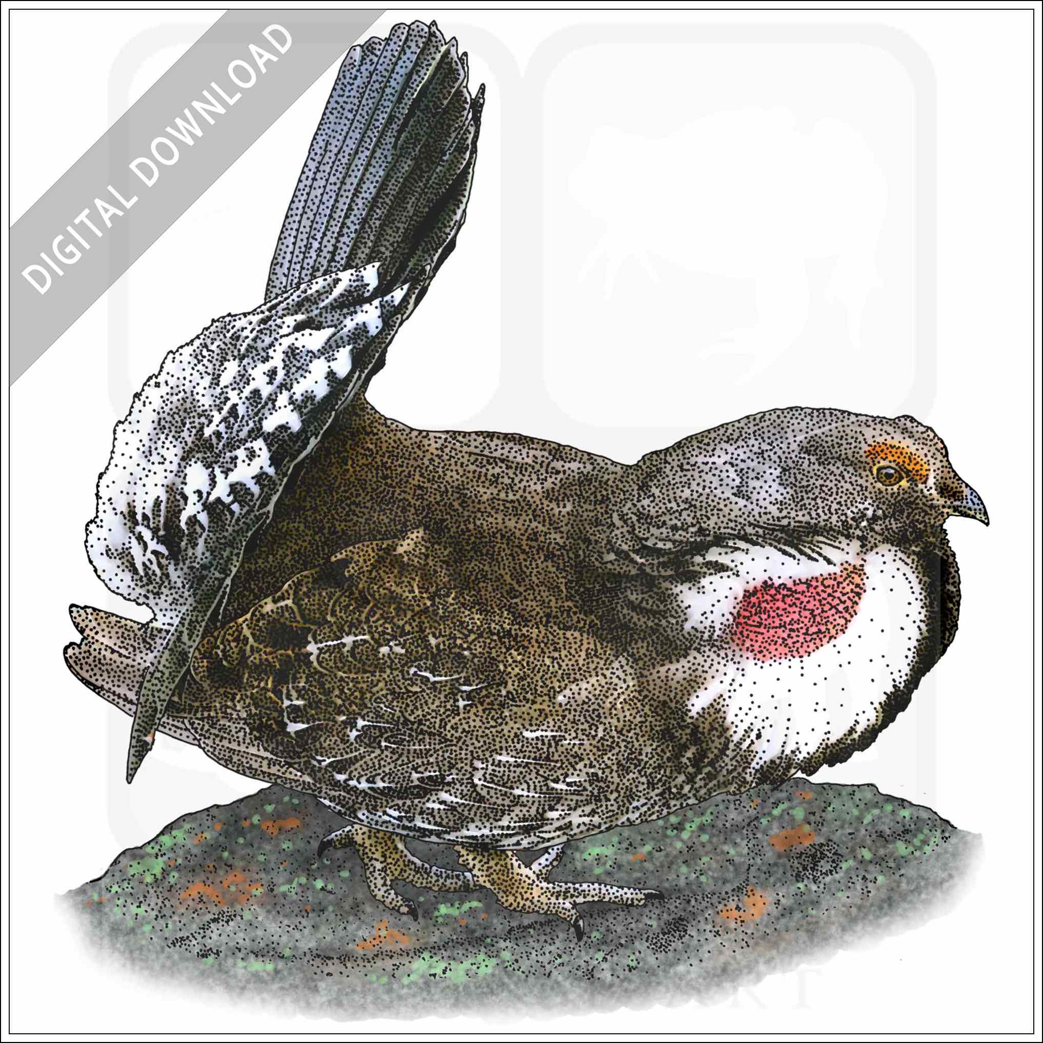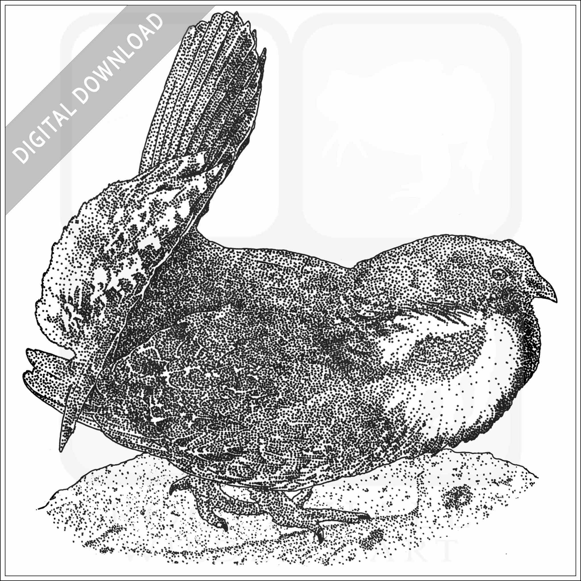 Stock art illustration of a Ruffed Grouse (Dendragapus obscurus.) The illustration is available in black and white or color for immediate download.