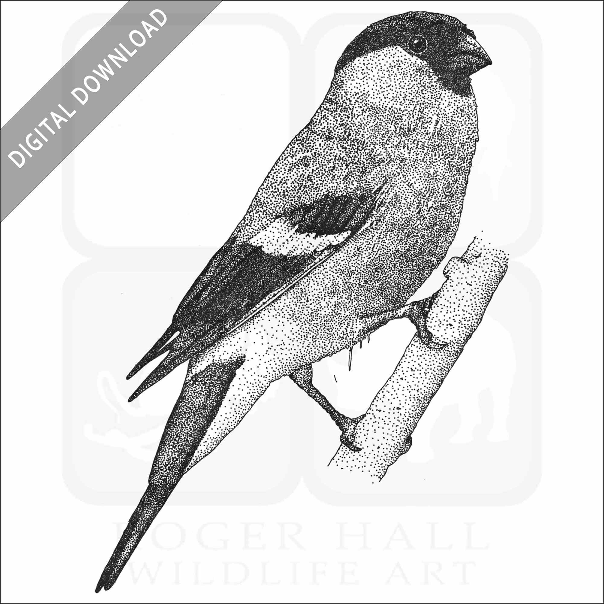 Stock art illustration of a Eurasian Bullfinch (Pyrrhula pyrrhula.)Â The illustration is available in black and white or color for immediate download.