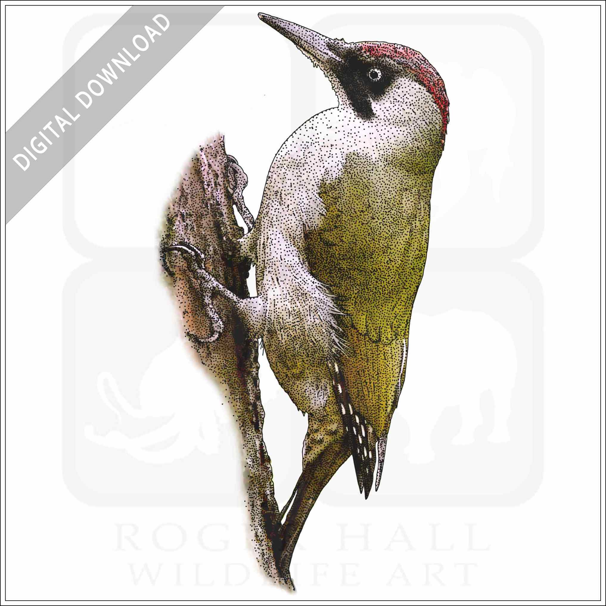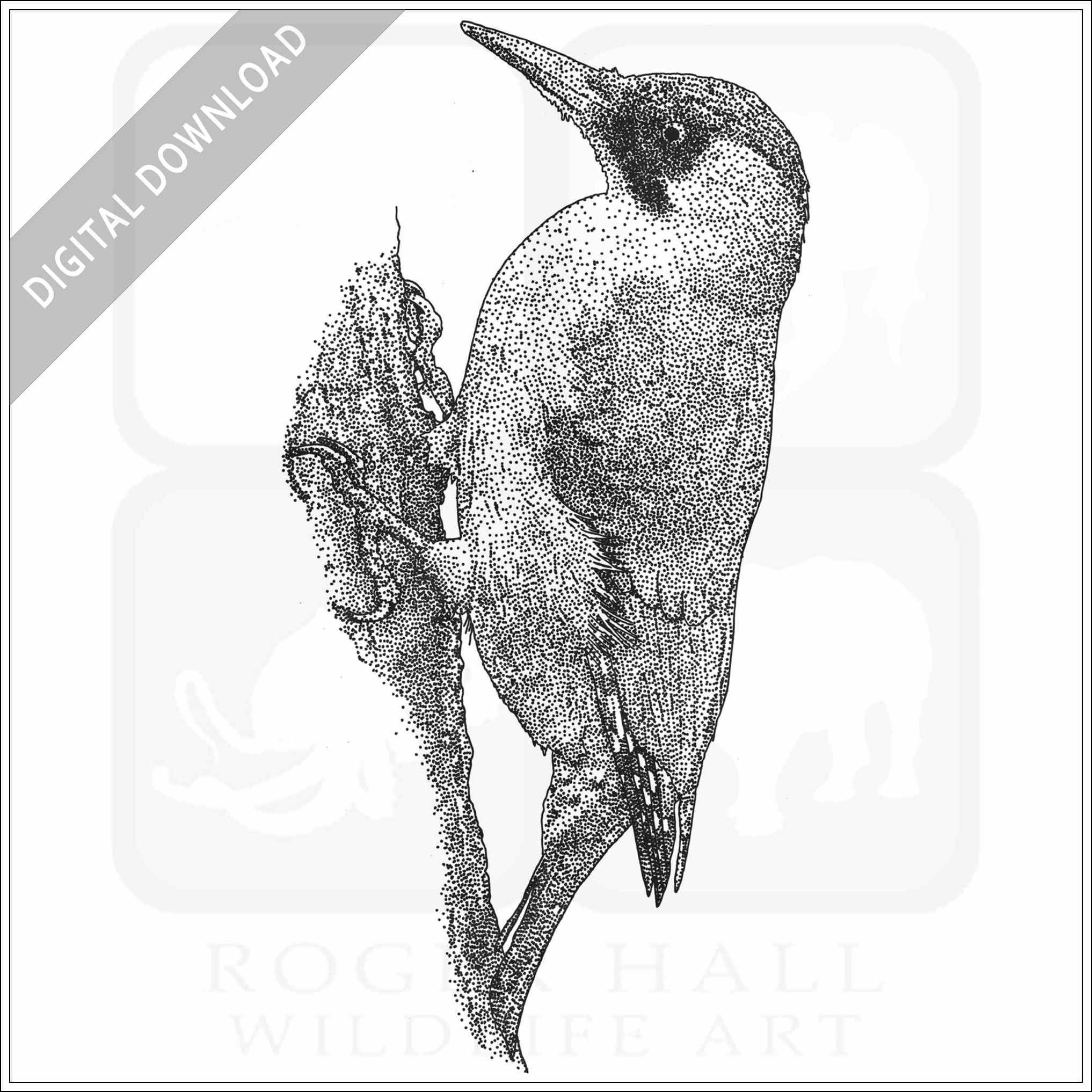 Stock art illustration of a European Green Woodpecker (Picus viridis.) Â The illustration is available in black and white or color for immediate download.